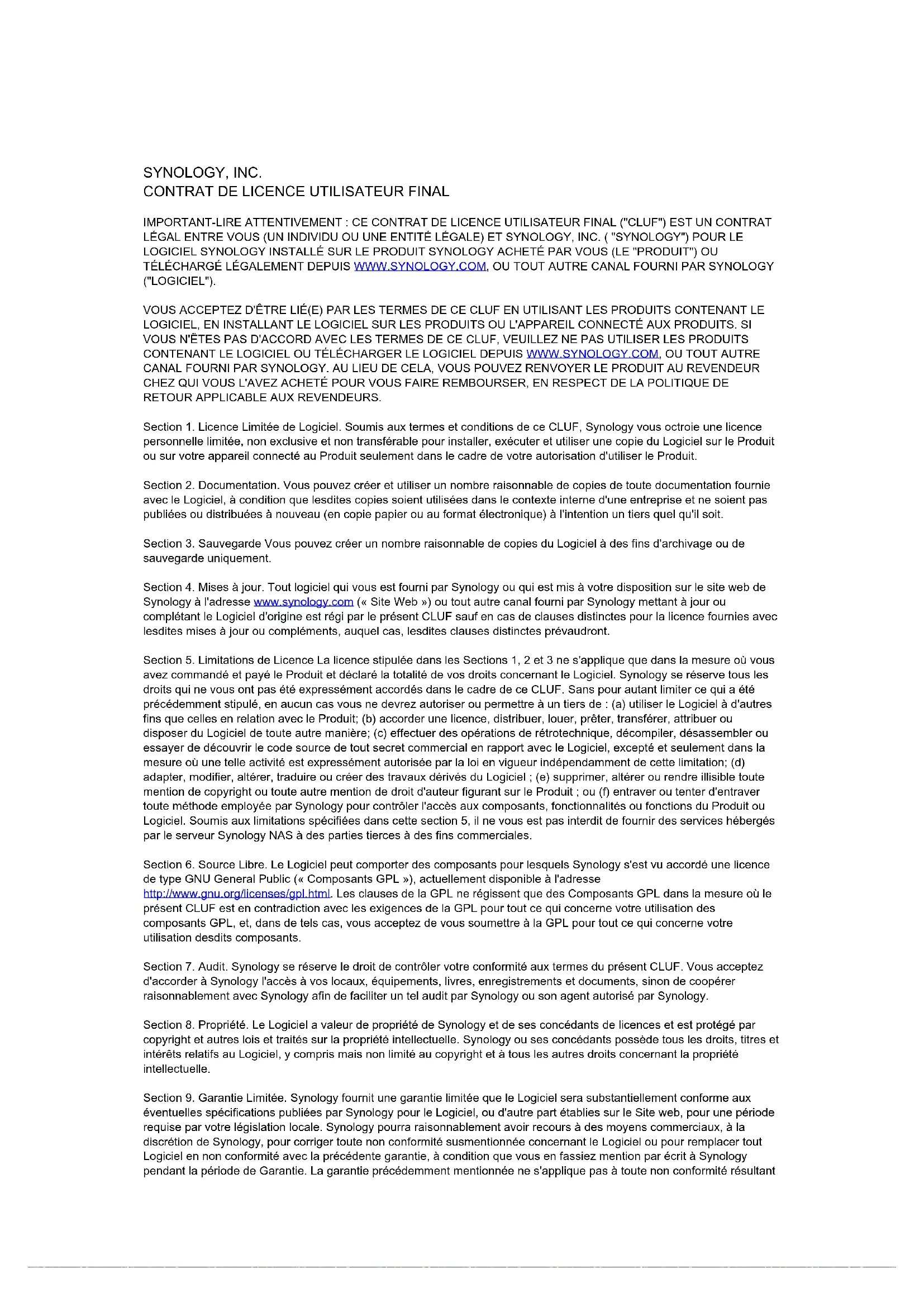 sauvegarde uniquement. Section 4. Mises à jour. Tout logiciel qui vous est fourni par Synology ou qui est mis à votre disposition sur le site web de Synology à l'adresse www.synology.com (« Site Web ») ou tout autre canal fourni par Synology mettant à jour ou complétant le Logiciel d'origine est régi par le présent CLUF sauf en cas de clauses distinctes pour la licence fournies avec lesdites mises à jour ou compléments, auquel cas, lesdites clauses distinctes prévaudront. Section 5. Limitations de Licence La licence stipulée dans les Sections 1, 2 et 3 ne s'applique que dans la mesure où vous avez commandé et payé le Produit et déclaré la totalité de vos droits concernant le Logiciel. Synology se réserve tous les droits qui ne vous ont pas été expressément accordés dans le cadre de ce CLUF. Sans pour autant limiter ce qui a été précédemment stipulé, en aucun cas vous ne devrez autoriser ou permettre à un tiers de : (a) utiliser le Logiciel à d'autres fins que celles en relation avec le Produit; (b) accorder une licence, distribuer, louer, prêter, transférer, attribuer ou disposer du Logiciel de toute autre manière; (c) effectuer des opérations de rétrotechnique, décompiler, désassembler ou essayer de découvrir le code source de tout secret commercial en rapport avec le Logiciel, excepté et seulement dans la mesure où une telle activité est expressément autorisée par la loi en vigueur indépendamment de cette limitation; (d) adapter, modifier, altérer, traduire ou créer des travaux dérivés du Logiciel ; (e) supprimer, altérer ou rendre illisible toute mention de copyright ou toute autre mention de droit d'auteur figurant sur le Produit ; ou (f) entraver ou tenter d'entraver toute méthode employée par Synology pour contrôler l'accès aux composants, fonctionnalités ou fonctions du Produit ou Logiciel. Soumis aux limitations spécifiées dans cette section 5, il ne vous est pas interdit de fournir des services hébergés par le serveur Synology NAS à des parties tierces à des fins commerciales.