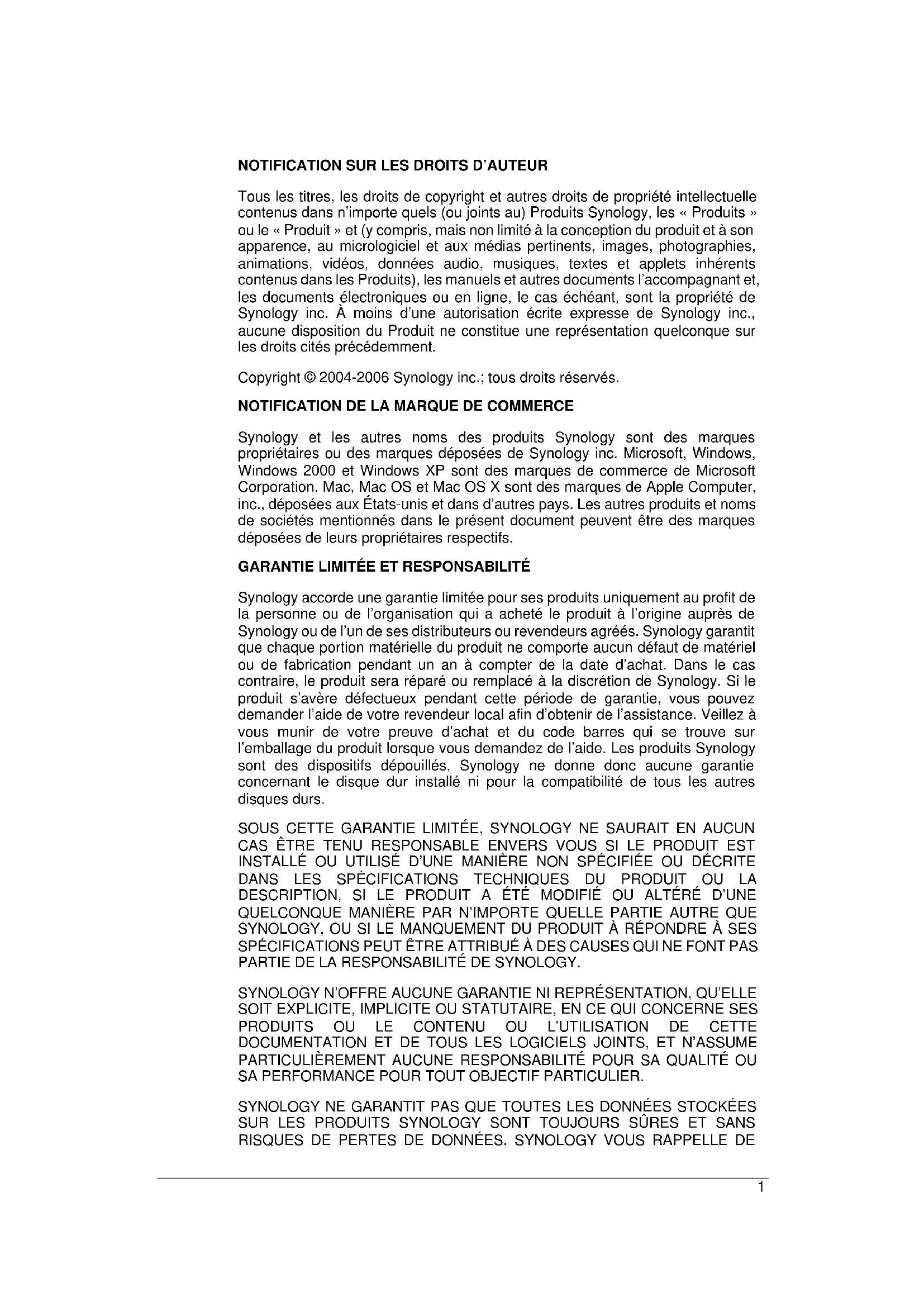 Syno406Series_UG_20060814_fra (Based on DS2.0 Ver. 2.0363)NOTIFICATION SUR LES DROITS D’AUTEUR Tous les titres, les droits de copyright et autres droits de propriété intellectuelle contenus dans n’importe quels (ou joints au) Produits Synology, les « Produits » ou le « Produit » et (y compris, mais non limité à la conception du produit et à son apparence, au micrologiciel et aux médias pertinents, images, photographies, animations, vidéos, données audio, musiques, textes et applets inhérents contenus dans les Produits), les manuels et autres documents l’accompagnant et, les documents électroniques ou en ligne, le cas échéant, sont la propriété de Synology inc. À moins d’une autorisation écrite expresse de Synology inc., aucune disposition du Produit ne constitue une représentation quelconque sur les droits cités précédemment. Copyright © 2004-2006 Synology inc.; tous droits réservés.