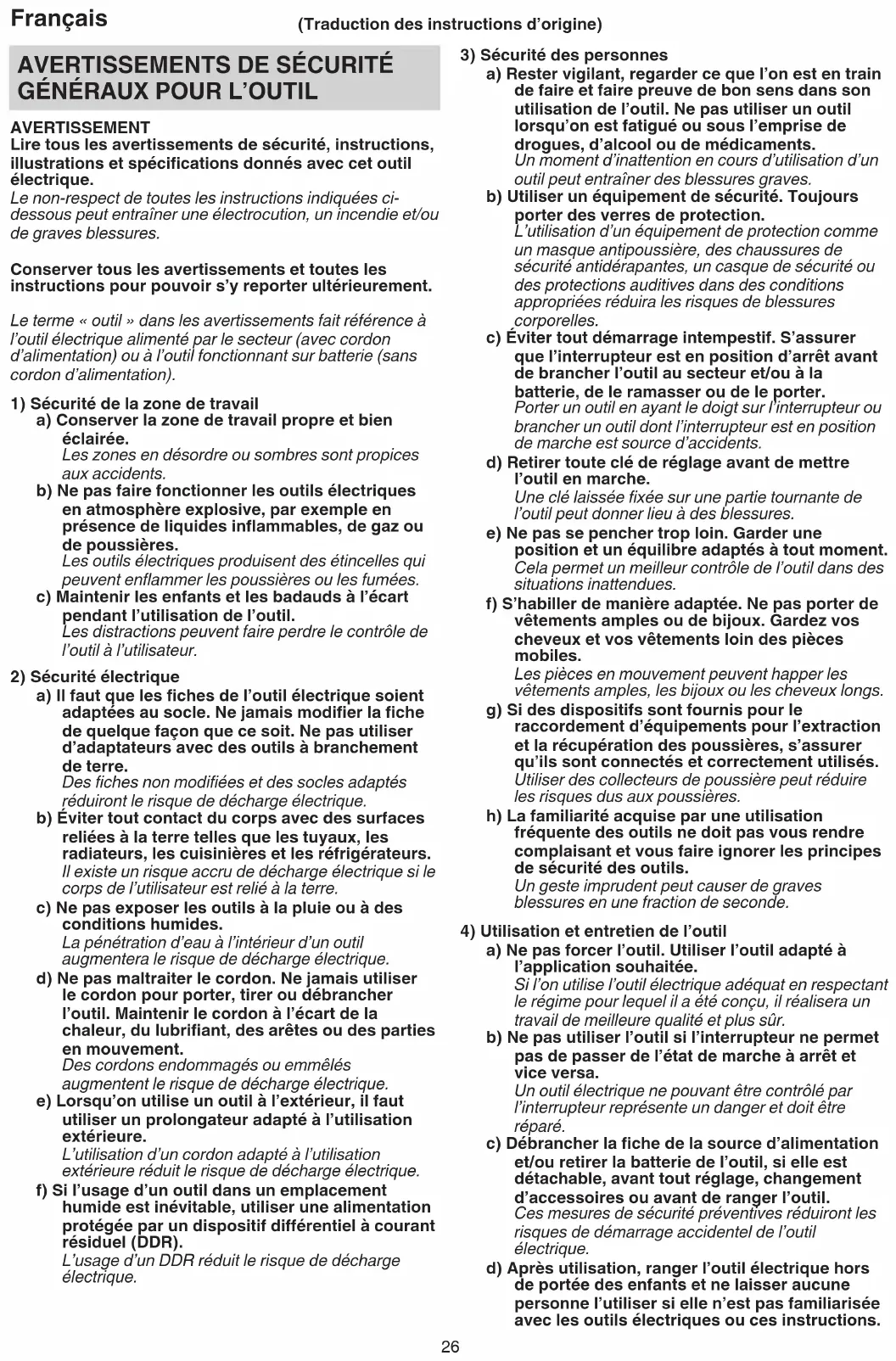 AVERTISSEMENT Lire tous les avertissements de sécurité, instructions, illustrations et spécifications donnés avec cet outil électrique. Le non-respect de toutes les instructions indiquées ci- dessous peut entraîner une électrocution, un incendie et/ou de graves blessures. Conserver tous les avertissements et toutes les instructions pour pouvoir s’y reporter ultérieurement. Le terme «outil» dans les avertissements fait référence à l’outil électrique alimenté par le secteur (avec cordon d’alimentation) ou à l’outil fonctionnant sur batterie (sans cordon d’alimentation).