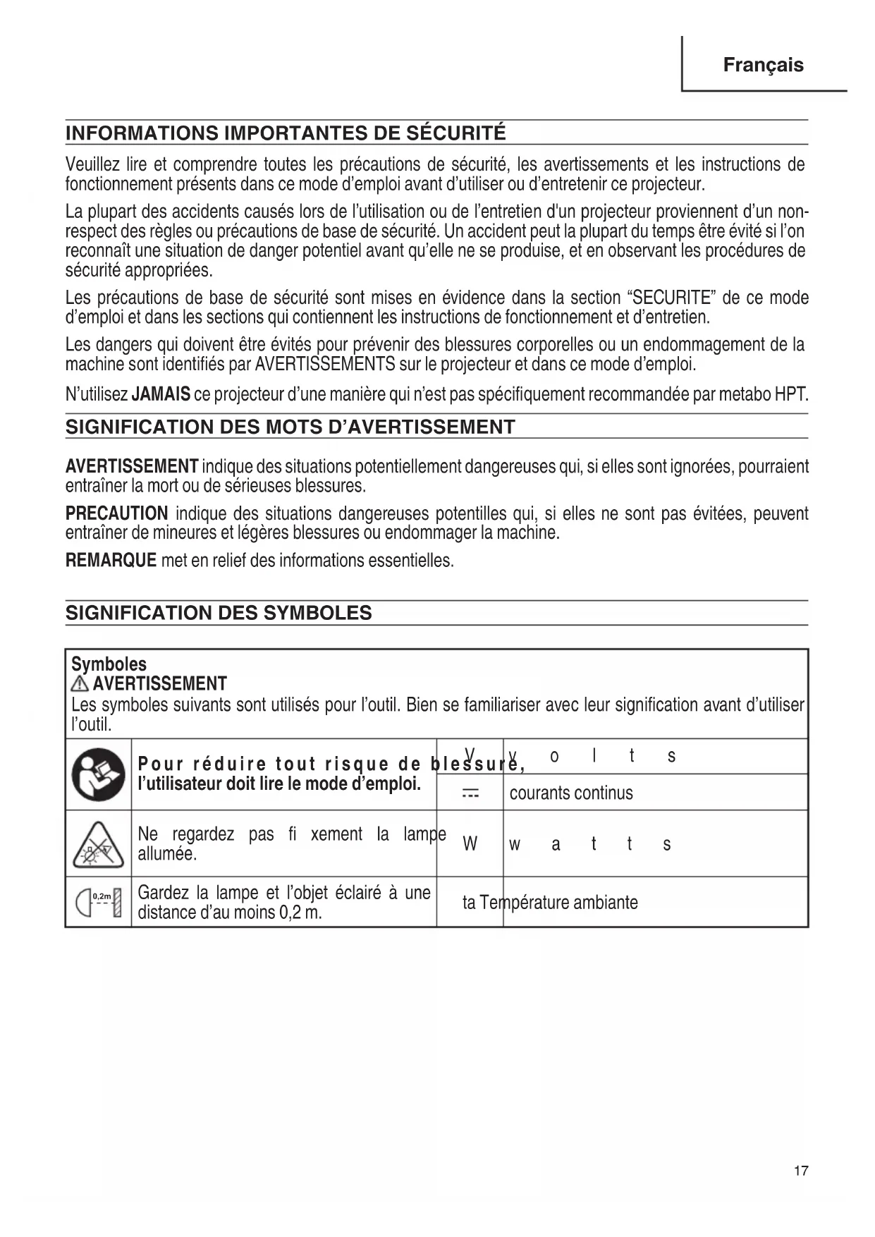 English 00BookUB18DHNA.indb1600BookUB18DHNA.indb16 2022/11/2110:04:592022/11/2110:04:59INFORMATIONS IMPORTANTES DE SÉCURITÉ Veuillez lire et comprendre toutes les précautions de sécurité, les avertissements et les instructions de fonctionnement présents dans ce mode d’emploi avant d’utiliser ou d’entretenir ce projecteur. La plupart des accidents causés lors de l’utilisation ou de l’entretien d'un projecteur proviennent d’un non- respect des règles ou précautions de base de sécurité. Un accident peut la plupart du temps être évité si l’on reconnaît une situation de danger potentiel avant qu’elle ne se produise, et en observant les procédures de sécurité appropriées. Les précautions de base de sécurité sont mises en évidence dans la section “SECURITE” de ce mode d’emploi et dans les sections qui contiennent les instructions de fonctionnement et d’entretien. Les dangers qui doivent être évités pour prévenir des blessures corporelles ou un endommagement de la machine sont identifi és par AVERTISSEMENTS sur le projecteur et dans ce mode d’emploi. N’utilisez JAMAIS ce projecteur d’une manière qui n’est pas spécifi quement recommandée par metabo HPT.