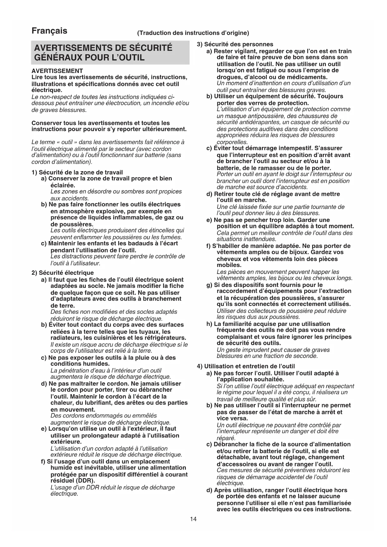 AVERTISSEMENT Lire tous les avertissements de sécurité, instructions, illustrations et spécifications donnés avec cet outil électrique. Le non-respect de toutes les instructions indiquées ci- dessous peut entraîner une électrocution, un incendie et/ou de graves blessures. Conserver tous les avertissements et toutes les instructions pour pouvoir s’y reporter ultérieurement. Le terme «outil» dans les avertissements fait référence à l’outil électrique alimenté par le secteur (avec cordon d’alimentation) ou à l’outil fonctionnant sur batterie (sans cordon d’alimentation).
