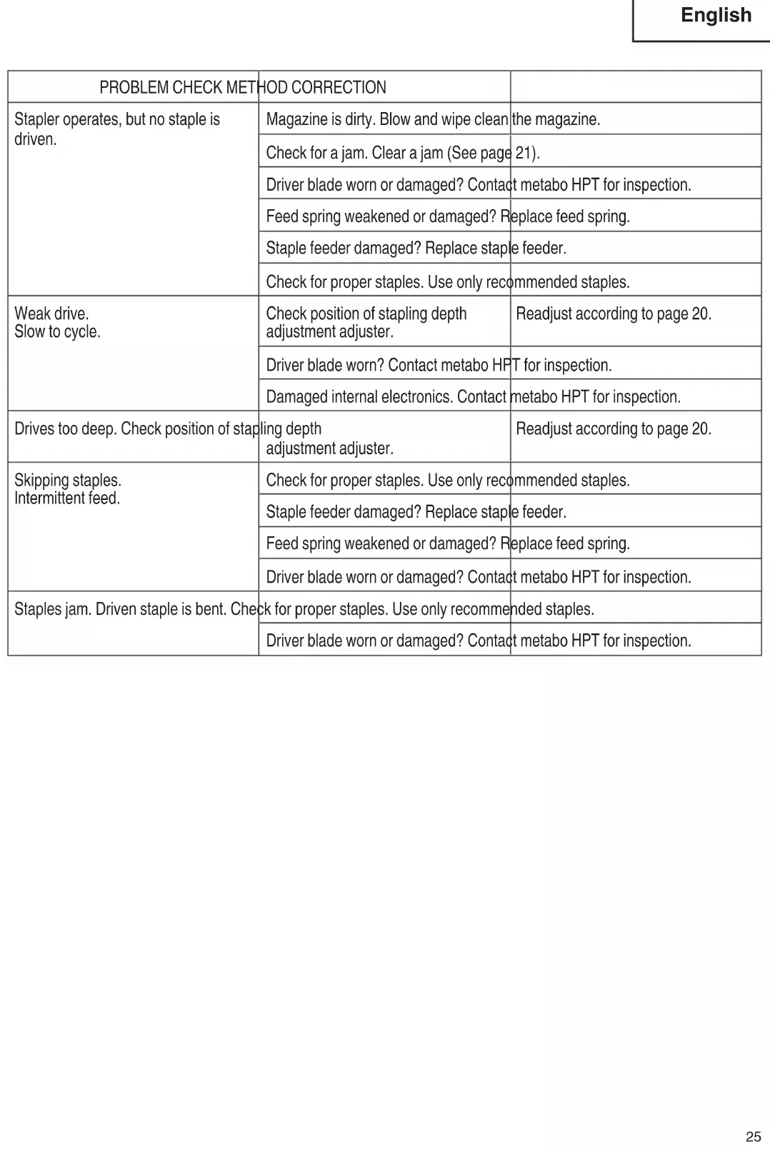 Nettoyer le magasin et le mécanisme de l’alimenteur de clous. Éviter que les clous ne se coincent. Nettoyer en soufflant de l’air tous les jours. Veiller à ce que le levier-poussoir fonctionne toujours correctement. Assurer la sécurité de l’opérateur et un fonctionnement efficace de l’agrafeuse. Nettoyer en soufflant de l’air tous les jours. Guide de dépannage pour l’utilisateur La plupart des problèmes bénins peuvent être rapidement et facilement corrigés au moyen du tableau ci-dessous. Si le problème persiste, communiquer avec un centre de service metabo HPT autorisé pour obtenir de l’aide.