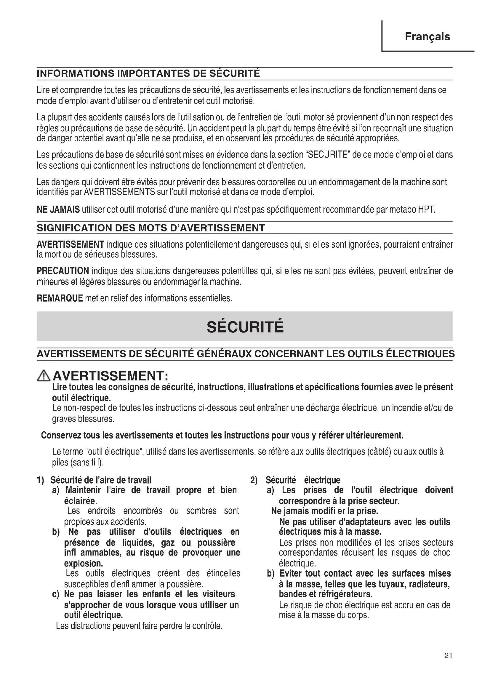 English 00BookD36DYANA.indb2000BookD36DYANA.indb20 2023/03/1715:18:532023/03/1715:18:53INFORMATIONS IMPORTANTES DE SÉCURITÉ Lire et comprendre toutes les précautions de sécurité, les avertissements et les instructions de fonctionnement dans ce mode d’emploi avant d’utiliser ou d’entretenir cet outil motorisé. La plupart des accidents causés lors de l’utilisation ou de l’entretien de l’outil motorisé proviennent d’un non respect des règles ou précautions de base de sécurité. Un accident peut la plupart du temps être évité si l’on reconnaît une situation de danger potentiel avant qu’elle ne se produise, et en observant les procédures de sécurité appropriées. Les précautions de base de sécurité sont mises en évidence dans la section “SECURITE” de ce mode d’emploi et dans les sections qui contiennent les instructions de fonctionnement et d’entretien. Les dangers qui doivent être évités pour prévenir des blessures corporelles ou un endommagement de la machine sont identifi és par AVERTISSEMENTS sur l’outil motorisé et dans ce mode d’emploi. NE JAMAIS utiliser cet outil motorisé d’une manière qui n’est pas spécifi quement recommandée par metabo HPT.