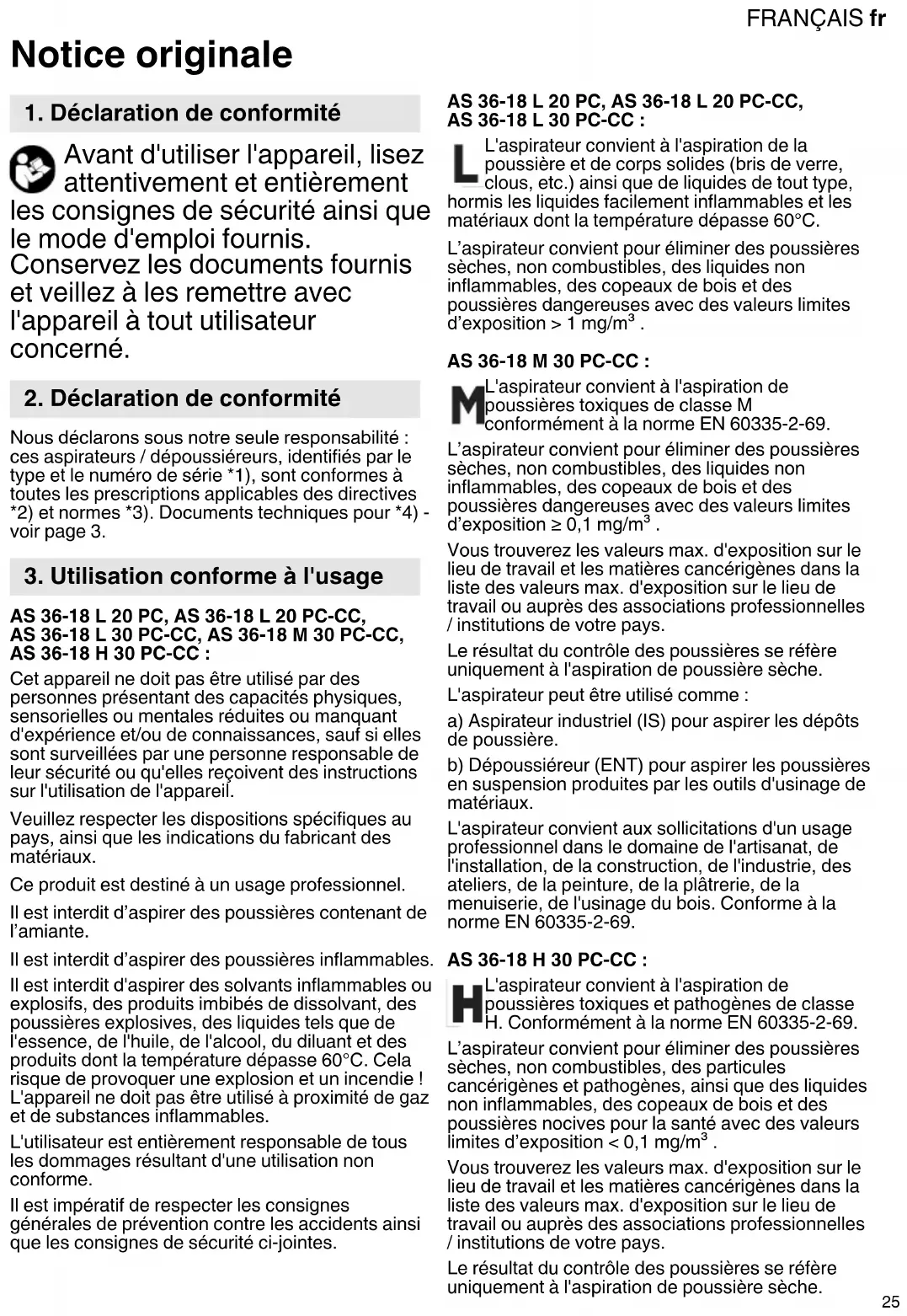 Notice originale Avant d'utiliser l'appareil, lisez attentivement et entièrement les consignes de sécurité ainsi que le mode d'emploi fournis. Conservez les documents fournis et veillez à les remettre avec l'appareil à tout utilisateur concerné. Nous déclarons sous notre seule responsabilité : ces aspirateurs / dépoussiéreurs, identifiés par le type et le numéro de série *1), sont conformes à toutes les prescriptions applicables des directives *2) et normes *3). Documents techniques pour *4) - voir page 3. AS 36-18 L 20 PC, AS 36-18 L 20 PC-CC, AS 36-18 L 30 PC-CC, AS 36-18 M 30 PC-CC, AS 36-18 H 30 PC-CC : Cet appareil ne doit pas être utilisé par des personnes présentant des capacités physiques, sensorielles ou mentales réduites ou manquant d'expérience et/ou de connaissances, sauf si elles sont surveillées par une personne responsable de leur sécurité ou qu'elles reçoivent des instructions sur l'utilisation de l'appareil. Veuillez respecter les dispositions spécifiques au pays, ainsi que les indications du fabricant des matériaux. Ce produit est destiné à un usage professionnel. Il est interdit d’aspirer des poussières contenant de l’amiante. Il est interdit d’aspirer des poussières inflammables. Il est interdit d'aspirer des solvants inflammables ou explosifs, des produits imbibés de dissolvant, des poussières explosives, des liquides tels que de l'essence, de l'huile, de l'alcool, du diluant et des produits dont la température dépasse 60°C. Cela risque de provoquer une explosion et un incendie ! L'appareil ne doit pas être utilisé à proximité de gaz et de substances inflammables. L'utilisateur est entièrement responsable de tous les dommages résultant d'une utilisation non conforme. Il est impératif de respecter les consignes générales de prévention contre les accidents ainsi que les consignes de sécurité ci-jointes. AS 36-18 L 20 PC, AS 36-18 L 20 PC-CC, AS 36-18 L 30 PC-CC : L'aspirateur convient à l'aspiration de la poussière et de corps solides (bris de verre, clous, etc.) ainsi que de liquides de tout type, hormis les liquides facilement inflammables et les matériaux dont la température dépasse 60°C. L’aspirateur convient pour éliminer des poussières sèches, non combustibles, des liquides non inflammables, des copeaux de bois et des poussières dangereuses avec des valeurs limites d’exposition > 1 mg/m³ . AS 36-18 M 30 PC-CC : L'aspirateur convient à l'aspiration de poussières toxiques de classe M conformément à la norme EN 60335-2-69. L’aspirateur convient pour éliminer des poussières sèches, non combustibles, des liquides non inflammables, des copeaux de bois et des poussières dangereuses avec des valeurs limites d’exposition ≥ 0,1 mg/m³ . Vous trouverez les valeurs max. d'exposition sur le lieu de travail et les matières cancérigènes dans la liste des valeurs max. d'exposition sur le lieu de travail ou auprès des associations professionnelles / institutions de votre pays. Le résultat du contrôle des poussières se réfère uniquement à l'aspiration de poussière sèche. L'aspirateur peut être utilisé comme : a) Aspirateur industriel (IS) pour aspirer les dépôts de poussière. b) Dépoussiéreur (ENT) pour aspirer les poussières en suspension produites par les outils d'usinage de matériaux. L'aspirateur convient aux sollicitations d'un usage professionnel dans le domaine de l'artisanat, de l'installation, de la construction, de l'industrie, des ateliers, de la peinture, de la plâtrerie, de la menuiserie, de l'usinage du bois. Conforme à la norme EN 60335-2-69. AS 36-18 H 30 PC-CC : L'aspirateur convient à l'aspiration de poussières toxiques et pathogènes de classe H. Conformément à la norme EN 60335-2-69. L’aspirateur convient pour éliminer des poussières sèches, non combustibles, des particules cancérigènes et pathogènes, ainsi que des liquides non inflammables, des copeaux de bois et des poussières nocives pour la santé avec des valeurs limites d’exposition < 0,1 mg/m³ . Vous trouverez les valeurs max. d'exposition sur le lieu de travail et les matières cancérigènes dans la liste des valeurs max. d'exposition sur le lieu de travail ou auprès des associations professionnelles / institutions de votre pays. Le résultat du contrôle des poussières se réfère uniquement à l'aspiration de poussière sèche.