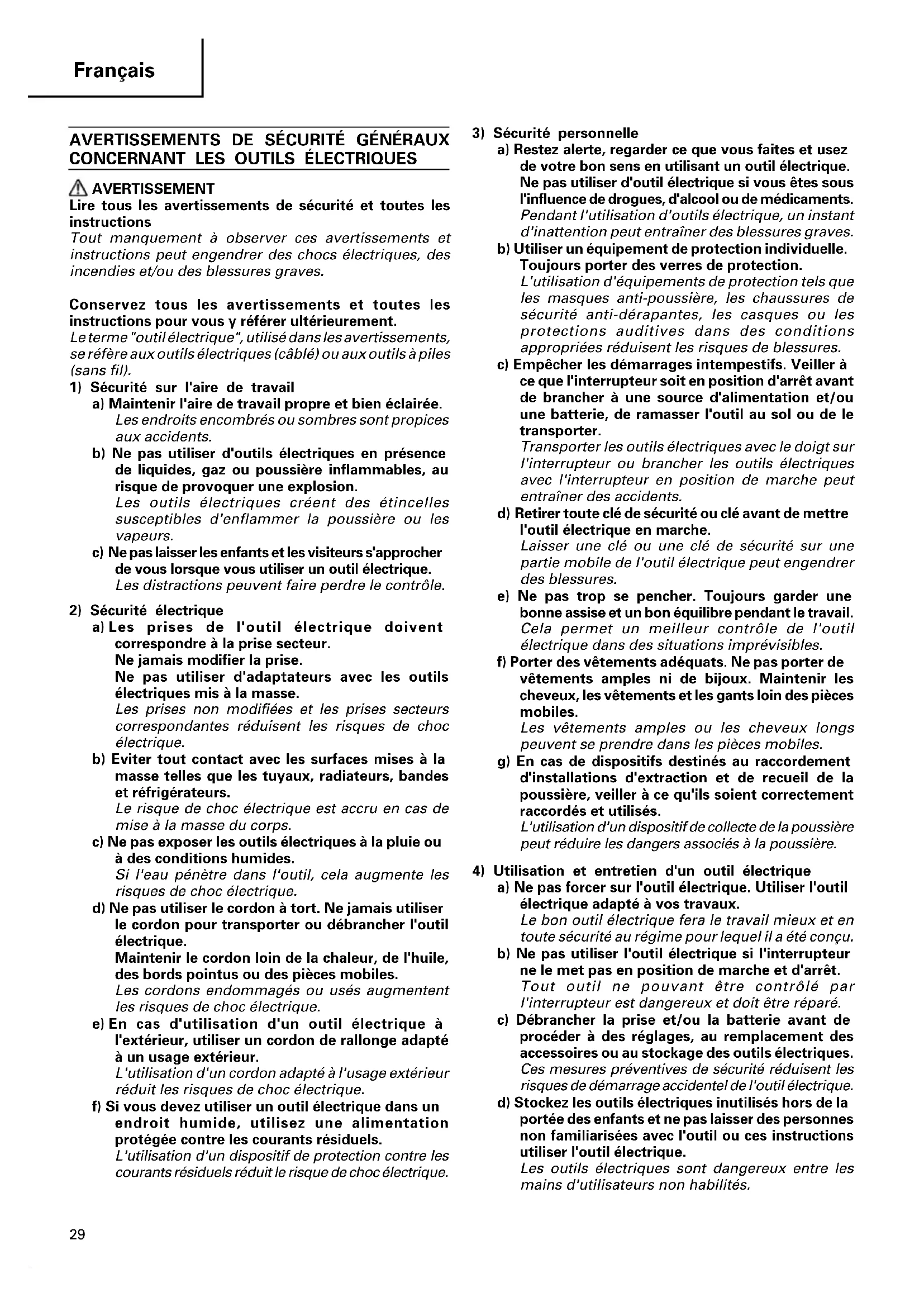 AVERTISSEMENT Lire tous les avertissements de sécurité et toutes les instructions Tout manquement à observer ces avertissements et instructions peut engendrer des chocs électriques, des incendies et/ou des blessures graves. Conservez tous les avertissements et toutes les instructions pour vous y référer ultérieurement. Le terme "outil électrique", utilisé dans les avertissements, se réfère aux outils électriques (câblé) ou aux outils à piles (sans fil).