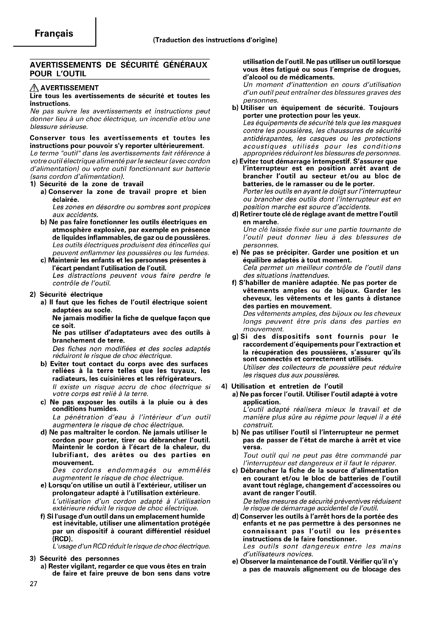 AVERTISSEMENT Lire tous les avertissements de sécurité et toutes les instructions. Ne pas suivre les avertissements et instructions peut donner lieu à un choc électrique, un incendie et/ou une blessure sérieuse. Conserver tous les avertissements et toutes les instructions pour pouvoir s'y reporter ultérieurement. Le terme "outil" dans les avertissements fait référence à votre outil électrique alimenté par le secteur (avec cordon d’alimentation) ou votre outil fonctionnant sur batterie (sans cordon d’alimentation).