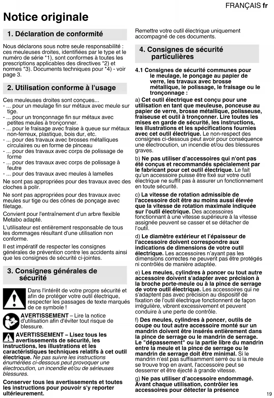 Notice originale Nous déclarons sous notre seule responsabilité : ces meuleuses droites, identifiées par le type et le numéro de série *1), sont conformes à toutes les prescriptions applicables des directives *2) et normes *3). Documents techniques pour *4) - voir page 3. Ces meuleuses droites sont conçues... - ... pour un meulage fin sur métaux avec meule sur tige. - ... pour un tronçonnage fin sur métaux avec petites meules à tronçonner. - ... pour le fraisage avec fraise à queue sur métaux non-ferreux, plastique, bois dur, etc. - ... pour des travaux avec brosses métalliques circulaires ou en forme de pinceau - ... pour des travaux avec corps de polissage de forme - ... pour des travaux avec corps de polissage à feutre - ... pour des travaux avec meules à lamelles Ne sont pas appropriées pour des travaux avec des cloches à polir. Ne sont pas appropriées pour des travaux avec meules sur tige ou des cônes de ponçage avec filetage. Convient pour l'entraînement d'un arbre flexible Metabo adapté. L'utilisateur est entièrement responsable de tous les dommages résultant d'une utilisation non conforme. Il est impératif de respecter les consignes générales de prévention contre les accidents ainsi que les consignes de sécurité ci-jointes. Dans l'intérêt de votre propre sécurité et afin de protéger votre outil électrique, respecter les passages de texte marqués de ce symbole ! AVERTISSEMENT – Lire la notice d'utilisation afin d'éviter tout risque de blessure. AVERTISSEMENT – Lisez tous les avertissements de sécurité, les instructions, les illustrations et les caractéristiques techniques relatifs à cet outil électrique. Ne pas suivre les instructions énumérées ci-dessous peut provoquer une électrocution, un incendie et/ou de sérieuses blessures. Conserver tous les avertissements et toutes les instructions pour pouvoir s'y reporter ultérieurement. Remettre votre outil électrique uniquement accompagné de ces documents.