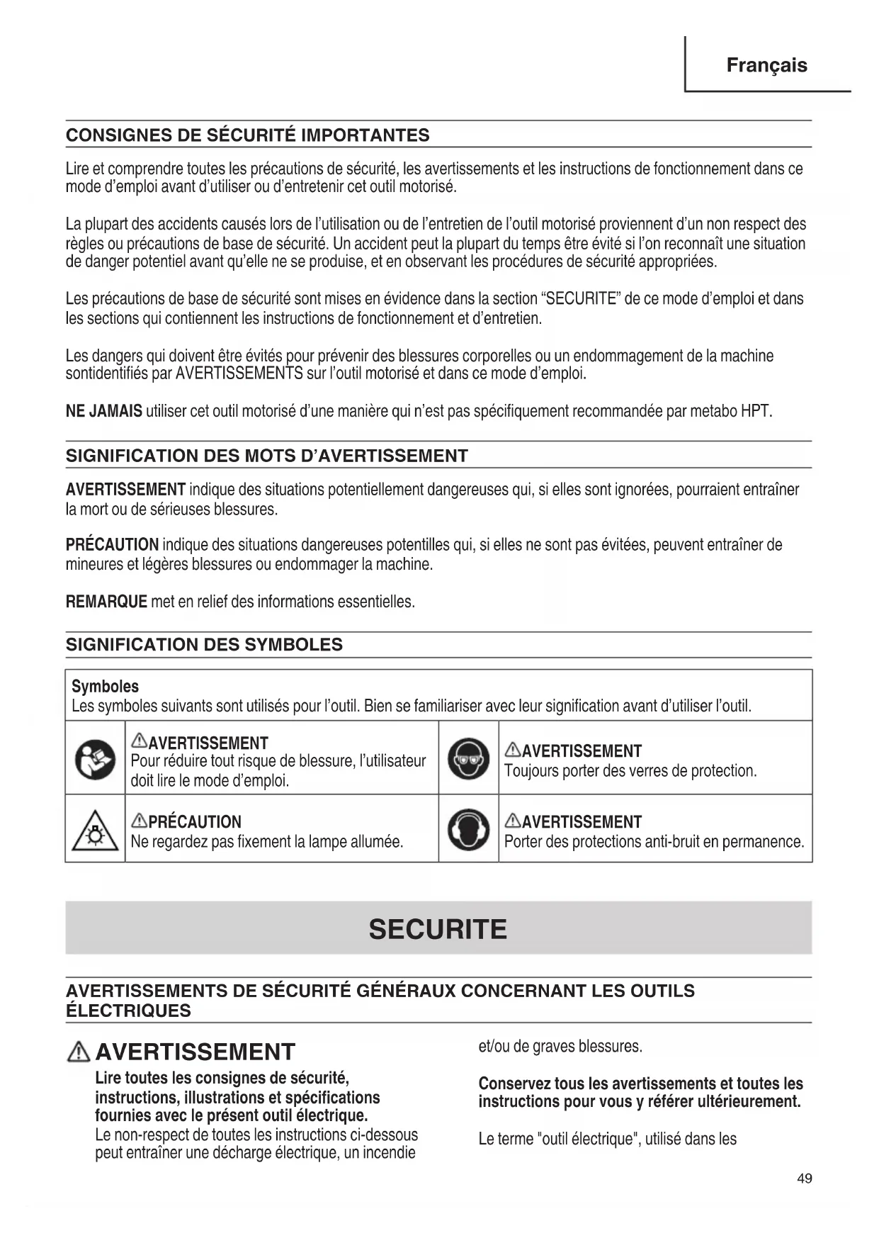 Lire et comprendre toutes les précautions de sécurité, les avertissements et les instructions de fonctionnement dans ce mode d’emploi avant d’utiliser ou d’entretenir cet outil motorisé. La plupart des accidents causés lors de l’utilisation ou de l’entretien de l’outil motorisé proviennent d’un non respect des règles ou précautions de base de sécurité. Un accident peut la plupart du temps être évité si l’on reconnaît une situation de danger potentiel avant qu’elle ne se produise, et en observant les procédures de sécurité appropriées. Les précautions de base de sécurité sont mises en évidence dans la section “SECURITE” de ce mode d’emploi et dans les sections qui contiennent les instructions de fonctionnement et d’entretien. Les dangers qui doivent être évités pour prévenir des blessures corporelles ou un endommagement de la machine sontidentifiés par AVERTISSEMENTS sur l’outil motorisé et dans ce mode d’emploi. NE JAMAIS utiliser cet outil motorisé d’une manière qui n’est pas spécifiquement recommandée par metabo HPT.