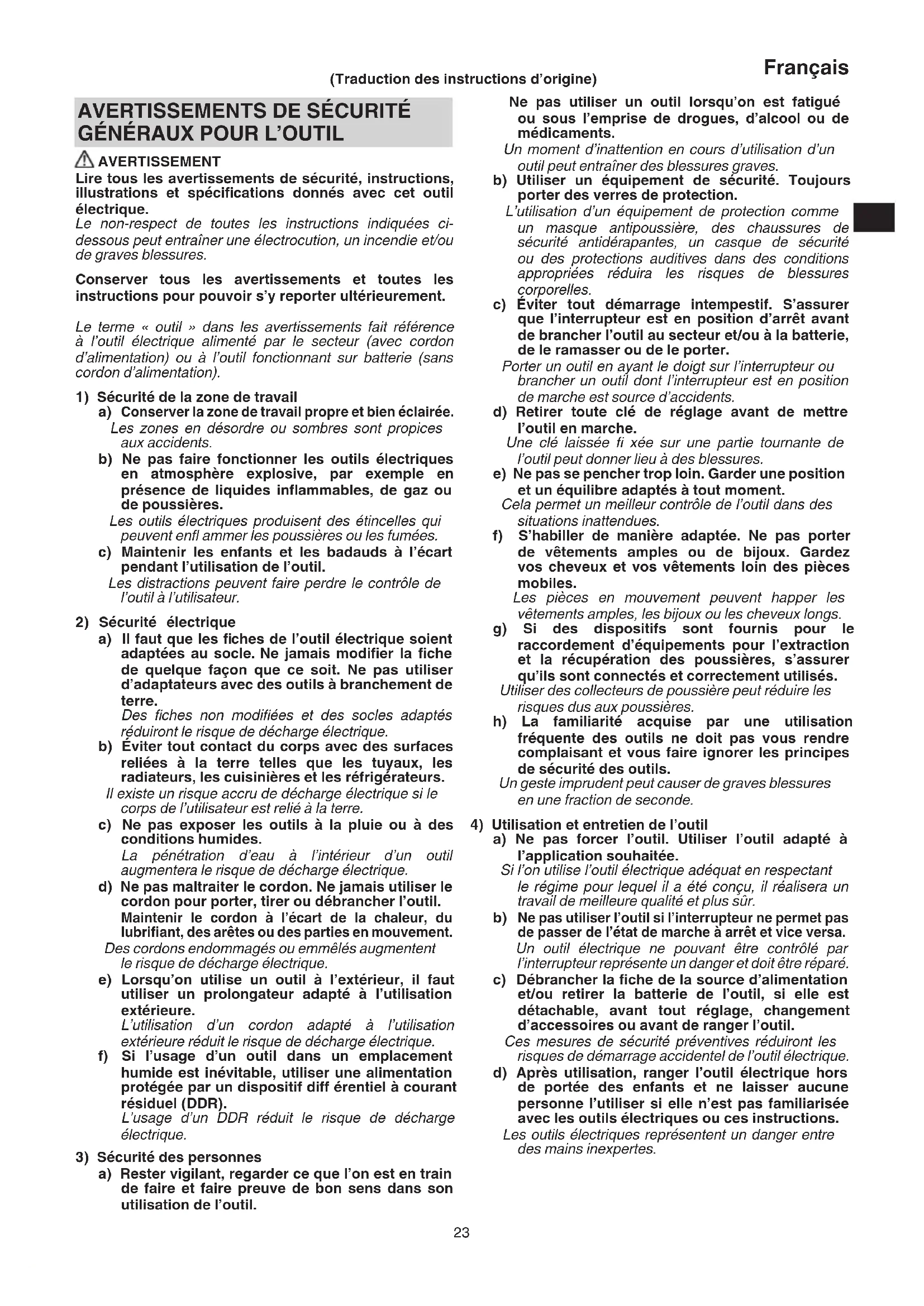 a) Rester vigilant, regarder ce que l’on est en train de faire et faire preuve de bon sens dans son utilisation de l’outil. (Traduction des instructions d’origine) 0000BookC6MEY2.indb230000BookC6MEY2.indb23 2022/11/1516:14:252022/11/1516:14:2524 Français e) Entretenir les outils électriques et les accessoires. Assurez-vous que les pièces en mouvement ne sont pas désalignées ou coincées, qu’aucune pièce n’est cassée ou que l’outil électrique n’a subi aucun dommage pouvant aff ecter son bon fonctionnement. Si l’outil électrique est endommagé, le faire réparer avant de le réutiliser. De nombreux accidents sont dus à des outils mal entretenus. f) Garder aff ûtés et propres les outils permettant de couper. Un outil bien entretenu aux bords bien aff ûtés risquera moins de se coincer et sera plus facile à maîtriser. g) Utiliser l’outil, les accessoires et les lames, etc., conformément à ces instructions, en tenant compte des conditions de travail et du travail à réaliser. L’utilisation d’un outil électrique à des fi ns autres que celles prévues est potentiellement dangereuse. h) Garder les poignées et les surfaces de préhension propres, sèches et exemptes d’huile et de graisse. Les poignées et surfaces de préhension glissantes ne permettent pas de manipuler et de contrôler l'outil de manière sûre dans des situations inattendues.