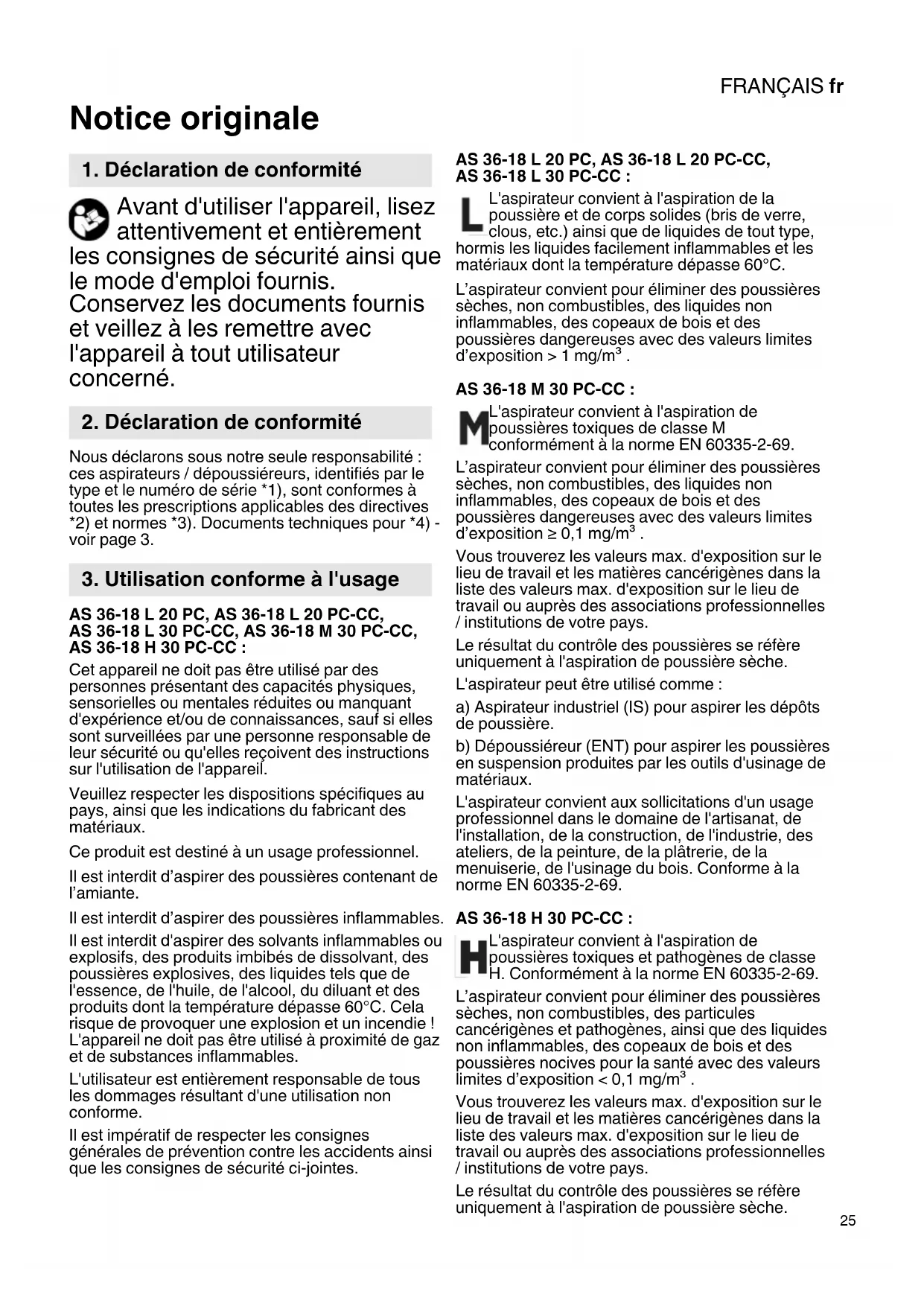 Notice originale Avant d'utiliser l'appareil, lisez attentivement et entièrement les consignes de sécurité ainsi que le mode d'emploi fournis. Conservez les documents fournis et veillez à les remettre avec l'appareil à tout utilisateur concerné. Nous déclarons sous notre seule responsabilité : ces aspirateurs / dépoussiéreurs, identifiés par le type et le numéro de série *1), sont conformes à toutes les prescriptions applicables des directives *2) et normes *3). Documents techniques pour *4) - voir page 3. AS 36-18 L 20 PC, AS 36-18 L 20 PC-CC, AS 36-18 L 30 PC-CC, AS 36-18 M 30 PC-CC, AS 36-18 H 30 PC-CC : Cet appareil ne doit pas être utilisé par des personnes présentant des capacités physiques, sensorielles ou mentales réduites ou manquant d'expérience et/ou de connaissances, sauf si elles sont surveillées par une personne responsable de leur sécurité ou qu'elles reçoivent des instructions sur l'utilisation de l'appareil. Veuillez respecter les dispositions spécifiques au pays, ainsi que les indications du fabricant des matériaux. Ce produit est destiné à un usage professionnel. Il est interdit d’aspirer des poussières contenant de l’amiante. Il est interdit d’aspirer des poussières inflammables. Il est interdit d'aspirer des solvants inflammables ou explosifs, des produits imbibés de dissolvant, des poussières explosives, des liquides tels que de l'essence, de l'huile, de l'alcool, du diluant et des produits dont la température dépasse 60°C. Cela risque de provoquer une explosion et un incendie ! L'appareil ne doit pas être utilisé à proximité de gaz et de substances inflammables. L'utilisateur est entièrement responsable de tous les dommages résultant d'une utilisation non conforme. Il est impératif de respecter les consignes générales de prévention contre les accidents ainsi que les consignes de sécurité ci-jointes. AS 36-18 L 20 PC, AS 36-18 L 20 PC-CC, AS 36-18 L 30 PC-CC : L'aspirateur convient à l'aspiration de la poussière et de corps solides (bris de verre, clous, etc.) ainsi que de liquides de tout type, hormis les liquides facilement inflammables et les matériaux dont la température dépasse 60°C. L’aspirateur convient pour éliminer des poussières sèches, non combustibles, des liquides non inflammables, des copeaux de bois et des poussières dangereuses avec des valeurs limites d’exposition > 1 mg/m³ . AS 36-18 M 30 PC-CC : L'aspirateur convient à l'aspiration de poussières toxiques de classe M conformément à la norme EN 60335-2-69. L’aspirateur convient pour éliminer des poussières sèches, non combustibles, des liquides non inflammables, des copeaux de bois et des poussières dangereuses avec des valeurs limites d’exposition ≥ 0,1 mg/m³ . Vous trouverez les valeurs max. d'exposition sur le lieu de travail et les matières cancérigènes dans la liste des valeurs max. d'exposition sur le lieu de travail ou auprès des associations professionnelles / institutions de votre pays. Le résultat du contrôle des poussières se réfère uniquement à l'aspiration de poussière sèche. L'aspirateur peut être utilisé comme : a) Aspirateur industriel (IS) pour aspirer les dépôts de poussière. b) Dépoussiéreur (ENT) pour aspirer les poussières en suspension produites par les outils d'usinage de matériaux. L'aspirateur convient aux sollicitations d'un usage professionnel dans le domaine de l'artisanat, de l'installation, de la construction, de l'industrie, des ateliers, de la peinture, de la plâtrerie, de la menuiserie, de l'usinage du bois. Conforme à la norme EN 60335-2-69. AS 36-18 H 30 PC-CC : L'aspirateur convient à l'aspiration de poussières toxiques et pathogènes de classe H. Conformément à la norme EN 60335-2-69. L’aspirateur convient pour éliminer des poussières sèches, non combustibles, des particules cancérigènes et pathogènes, ainsi que des liquides non inflammables, des copeaux de bois et des poussières nocives pour la santé avec des valeurs limites d’exposition < 0,1 mg/m³ . Vous trouverez les valeurs max. d'exposition sur le lieu de travail et les matières cancérigènes dans la liste des valeurs max. d'exposition sur le lieu de travail ou auprès des associations professionnelles / institutions de votre pays. Le résultat du contrôle des poussières se réfère uniquement à l'aspiration de poussière sèche.