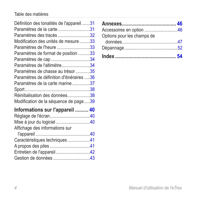baromètre 19 BaseCamp 43 câble USB 52 déconnexion 45 calculateur de voyage 20 restauration 39 calculatrice 25 calcul de zone 25 calendrier 25 carte 16, 17 affichage des itinéraires 13 configuration 32 détail 32 facultatif 46 informations 32 restauration 39 supplémentaire 11 système géodésique 34 carte mémoire 43 carte microSD 43 cartes BlueChart g2 11 cartes City Navigator 17 champs de données 28 options 47 chasses au trésor 21, 35 consignation d’une tentative 22 filtrage de la liste 21 navigation vers 22 paramètres 35 téléchargement 21 chirp 23 chronomètre 26 compas 17 étalonnage 18 navigation 18 options de configuration 34 restauration 39 Configuration avancée page Carte 32 connexion accessoires sans fil 46 à un autre appareil 24 création itinéraires 12 waypoints 9 Manuel d'utilisation de l'eTrex Index dépannage 52 écran capture d’écran 30 paramètres 30 temporisation rétroéclairage 30 enregistrement de l’appareil 8 enregistrement de tracés 32 entretien de l’appareil 42 rangement pour une longue période 42 étalonnage compas 18 format de position 33 heure alarmes 26 champs de données 48 lever et coucher du soleil 25, 49 paramètres 33 zone 33 heures de lever et coucher du soleil 25, 49 HomePort 43 Manuel d'utilisation de l'eTrex
