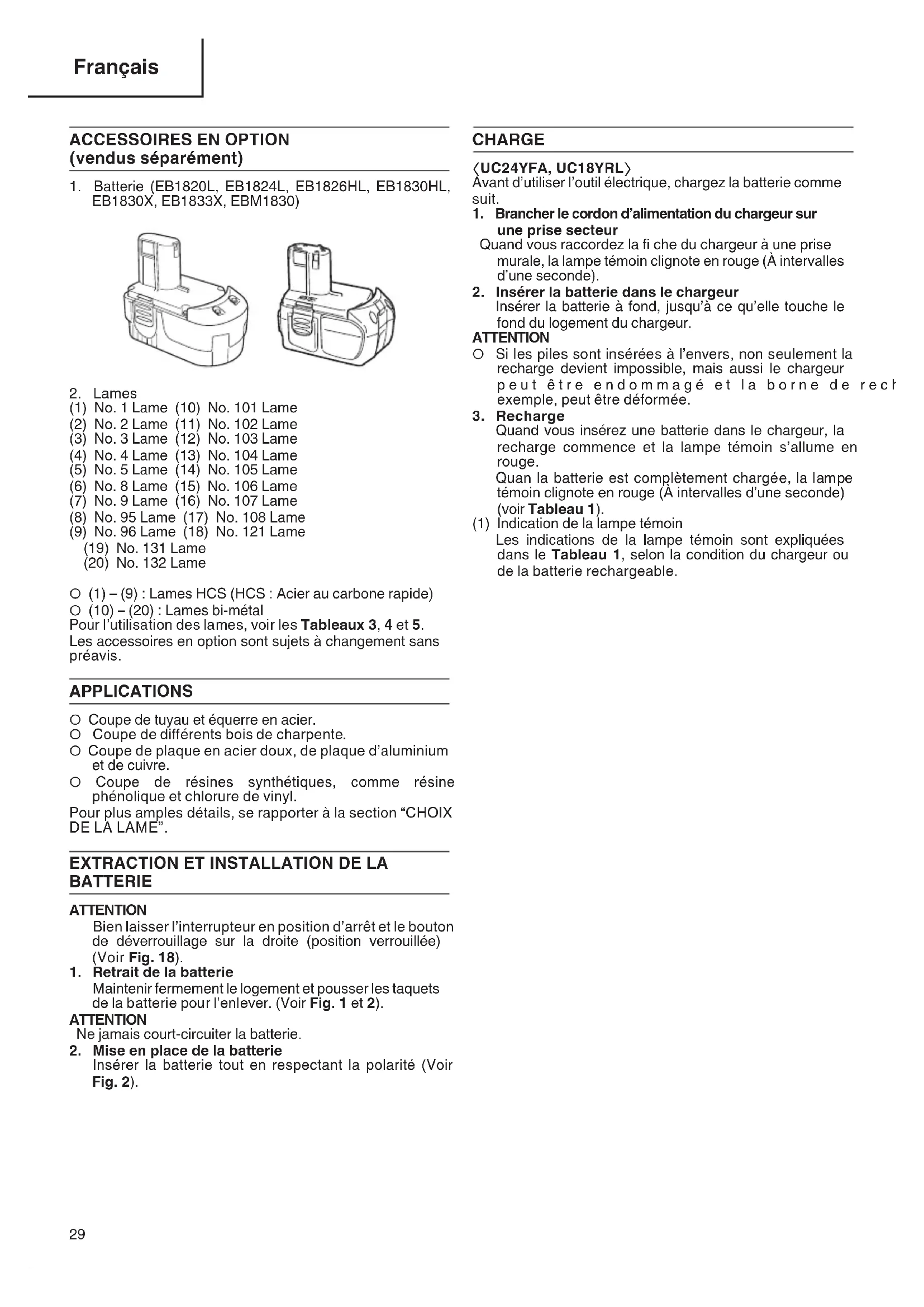Coursee 28 mm Capacité Tuyau en acier doux: Diam. ext. 90 mm Tube de chlorure de vinyle: Diam. ext. 90 mm Bois: Profondeur 90 mm Tôle d’acier doux: Epaisseur 10 mm Batterie rechargeable 18 V 2,0 Ah EB1820L: Ni-Cd (15 piles) x 18 V 2,6 Ah EB1826HL: Ni-MH (15 piles) x 18 V 3,0 Ah EB1830HL: Ni-MH (15 piles) EBM1830: Li-ion (10 piles) 18 V 3,0 Ah EB1830X: Ni-MH (15 piles) x 18 V 3,3 Ah EB1833X: Ni-MH (15 piles) x Poids 3,8 kg 3,4 kg Chargeur Modèle UC24YFA UC18YG UC18YRL Tension de chargement 7,2 – 24 V 7,2 – 18 V 7,2 – 18 V Durée de chargement 2,0 Ah : Ni-Cd 50 min. 50 min. 30 min. 2,6 Ah : Ni-MH 65 min. x 40 min. 3,0 Ah : Ni-MH 70 min. x 45 min. 3,3 Ah : Ni-MH 75 min. x 50 min. 3,0 Ah : Li-ion x x 45 min. Poids 0,6 Kg 0,3 Kg 0,6 Kg La durée de chargement est approximative. La durée réelle du chargement peut varier. “x” indique que la batterie n’est pas compatible avec ce chargeur spécifi que. ACCESSOIRES STANDARD CR18DMR CR18DL