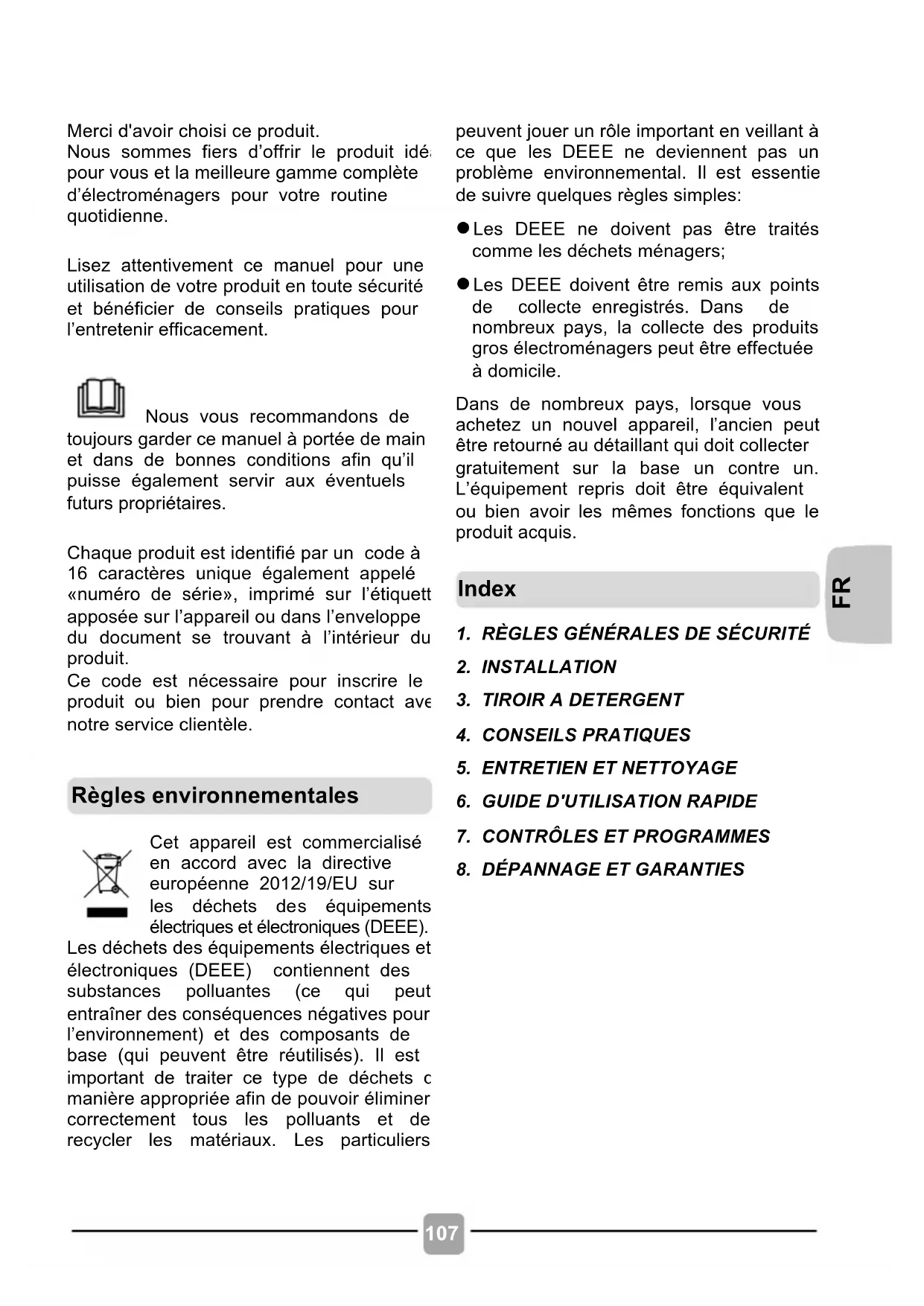 peuvent jouer un rôle important en veillant à ce que les DEEE ne deviennent pas un problème environnemental. Il est essentiel de suivre quelques règles simples: l Les DEEE ne doivent pas être traités comme les déchets ménagers; l Les DEEE doivent être remis aux points de collecte enregistrés. Dans de nombreux pays, la collecte des produits gros électroménagers peut être effectuée à domicile. Dans de nombreux pays, lorsque vous achetez un nouvel appareil, l’ancien peut être retourné au détaillant qui doit collecter gratuitement sur la base un contre un. L’équipement repris doit être équivalent ou bien avoir les mêmes fonctions que le produit acquis.