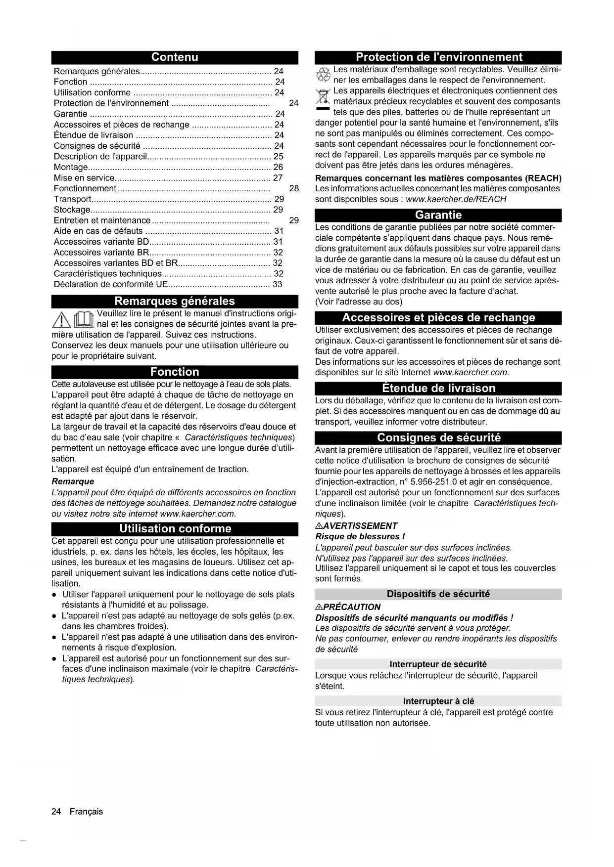 - dB(A)81818181 BD 70/75 W Classic Bp BR 75/75 W Classic Bp BD 80/100 W Classic Bp BR 85/100 W Classic Bp EU Declaration of Conformity Declaration of Conformity (UK)24 Français Contenu Remarques générales Veuillez lire le présent le manuel d'instructions origi- nal et les consignes de sécurité jointes avant la pre- mière utilisation de l'appareil. Suivez ces instructions. Conservez les deux manuels pour une utilisation ultérieure ou pour le propriétaire suivant. Fonction Cette autolaveuse est utilisée pour le nettoyage à l’eau de sols plats. L'appareil peut être adapté à chaque de tâche de nettoyage en réglant la quantité d'eau et de détergent. Le dosage du détergent est adapté par ajout dans le réservoir. La largeur de travail et la capacité des réservoirs d'eau douce et du bac d’eau sale (voir chapitre « Caractéristiques techniques) permettent un nettoyage efficace avec une longue durée d’utili- sation. L'appareil est équipé d'un entraînement de traction. Remarque L'appareil peut être équipé de différents accessoires en fonction des tâches de nettoyage souhaitées. Demandez notre catalogue ou visitez notre site internet www.kaercher.com. Utilisation conforme Cet appareil est conçu pour une utilisation professionnelle et idustriels, p. ex. dans les hôtels, les écoles, les hôpitaux, les usines, les bureaux et les magasins de loueurs. Utilisez cet ap- pareil uniquement suivant les indications dans cette notice d'uti- lisation. ● Utiliser l'appareil uniquement pour le nettoyage de sols plats résistants à l'humidité et au polissage. ● L'appareil n'est pas adapté au nettoyage de sols gelés (p.ex. dans les chambres froides). ● L'appareil n'est pas adapté à une utilisation dans des environ- nements à risque d'explosion. ● L'appareil est autorisé pour un fonctionnement sur des sur- faces d'une inclinaison maximale (voir le chapitre Caractéris- tiques techniques). Protection de l'environnement Les matériaux d'emballage sont recyclables. Veuillez élimi- ner les emballages dans le respect de l'environnement. Les appareils électriques et électroniques contiennent des matériaux précieux recyclables et souvent des composants tels que des piles, batteries ou de l'huile représentant un danger potentiel pour la santé humaine et l'environnement, s'ils ne sont pas manipulés ou éliminés correctement. Ces compo- sants sont cependant nécessaires pour le fonctionnement cor- rect de l'appareil. Les appareils marqués par ce symbole ne doivent pas être jetés dans les ordures ménagères. Remarques concernant les matières composantes (REACH) Les informations actuelles concernant les matières composantes sont disponibles sous : www.kaercher.de/REACH Garantie Les conditions de garantie publiées par notre société commer- ciale compétente s’appliquent dans chaque pays. Nous remé- dions gratuitement aux défauts possibles sur votre appareil dans la durée de garantie dans la mesure où la cause du défaut est un vice de matériau ou de fabrication. En cas de garantie, veuillez vous adresser à votre distributeur ou au point de service après- vente autorisé le plus proche avec la facture d’achat. (Voir l'adresse au dos) Accessoires et pièces de rechange Utiliser exclusivement des accessoires et pièces de rechange originaux. Ceux-ci garantissent le fonctionnement sûr et sans dé- faut de votre appareil. Des informations sur les accessoires et pièces de rechange sont disponibles sur le site Internet www.kaercher.com. Étendue de livraison Lors du déballage, vérifiez que le contenu de la livraison est com- plet. Si des accessoires manquent ou en cas de dommage dû au transport, veuillez informer votre distributeur. Consignes de sécurité Avant la première utilisation de l'appareil, veuillez lire et observer cette notice d'utilisation la brochure de consignes de sécurité fournie pour les appareils de nettoyage à brosses et les appareils d'injection-extraction, n° 5.956-251.0 et agir en conséquence. L'appareil est autorisé pour un fonctionnement sur des surfaces d'une inclinaison limitée (voir le chapitre Caractéristiques tech- niques). 몇 AVERTISSEMENT Risque de blessures ! L'appareil peut basculer sur des surfaces inclinées. N'utilisez pas l'appareil sur des surfaces inclinées. Utilisez l'appareil uniquement si le capot et tous les couvercles sont fermés. Dispositifs de sécurité 몇 PRÉCAUTION Dispositifs de sécurité manquants ou modifiés ! Les dispositifs de sécurité servent à vous protéger. Ne pas contourner, enlever ou rendre inopérants les dispositifs de sécurité Interrupteur de sécurité Lorsque vous relâchez l'interrupteur de sécurité, l'appareil s'éteint. Interrupteur à clé Si vous retirez l'interrupteur à clé, l'appareil est protégé contre toute utilisation non autorisée. Remarques générales p. 24