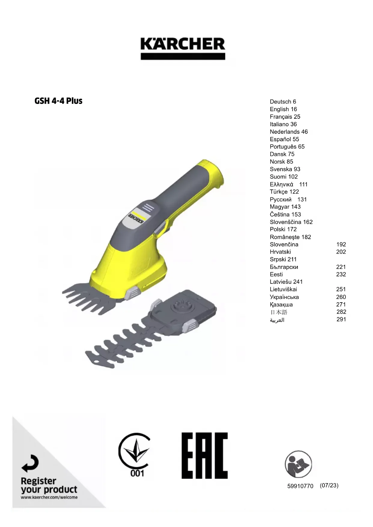 - dB(A) 82 Dimensions and weights Weight with grass shears kg 0,58 Weight with shrub shears kg 0,63 Length x width x height (with grass shears, without battery pack, with- out blade guard) mm 306 x 83 x 132 Length x width x height (with shrub shears, without battery pack, with- out blade guard) mm 392 x 81 x 132Français 25 Type: GSH 4-4 Plus Currently applicable EU Directives 2006/42/EC (+2009/127/EC) 2014/30/EU 2000/14/EC (+2005/88/EC) 2011/65/EU Harmonised standards used EN 55014-1: 2017 + A1: 2020 EN 55014-2: 1997+A1: 2001+A2: 2008 EN 62841-1:2015+A11 EN 62841-4-2:2019+A1+A11 EN 62841-4-5:2021+A11 EN IEC 63000: 2018 Conformity evaluation procedure used 2000/14/EC and amended by 2005/88/EC: Annex V (with shrub blade only) Sound power level dB(A) Measured: 78,92 Guaranteed: 82 The signatories act on behalf of and with the authority of the company management. Documentation supervisor: S. Reiser Alfred Kärcher SE & Co. KG Alfred-Kärcher-Str. 28 - 40 71364 Winnenden (Germany) Ph.: +49 7195 14-0 Fax: +49 7195 14-2212 Winnenden, 2023/06/01 Declaration of Conformity (UK) We hereby declare that the product described below complies with the relevant provisions of the following UK Regulations, both in its basic design and construc- tion as well as in the version put into circulation by us. This declaration shall cease to be valid if the product is modified without our prior approval. Product: Battery-operated grass and shrub shears Type: GSH 4-4 Plus Currently applicable UK Regulations S.I. 2008/1597 (as amended) S.I. 2016/1091 (as amended) S.I. 2001/1701 (as amended) S.I. 2012/3032 (as amended) Designated standards used EN 55014-1: 2017 + A1: 2020 EN 55014-2: 1997+A1: 2001+A2: 2008 EN 62841-1:2015+A11 EN 62841-4-2:2019+A1+A11 EN 62841-4-5:2021+A11 EN IEC 63000: 2018 Applied conformity assessment procedure S.I. 2001/1701 (as amended): Schedule 8 (with shrub blade only) Sound power level dB(A) Measured: 78,92 Guaranteed: 82 The signatories act on behalf of and with the authority of the company management. Documentation supervisor: S. Reiser Alfred Kärcher SE & Co. KG Alfred-Kärcher-Str. 28 - 40 71364 Winnenden (Germany) Ph.: +49 7195 14-0 Fax: +49 7195 14-2212 Winnenden, 2023/06/01 Contenu Consignes de sécurité Avant la première utilisation de l’appareil, veuil- lez lire cette notice originale et les consignes de sécurité ainsi que les notices originales et les consignes de sécurité jointes au bloc-batterie et au chargeur. Suivez leurs instructions. Conservez tous les manuels d'utilisation pour une utili- sation ultérieure ou pour le propriétaire suivant. Outre les remarques dans ces manuels d'utilisation, vous devez prendre en compte les directives générales de sécurité et les directives pour la prévention des acci- dents du législateur. Niveaux de danger DANGER ● Indique un danger immédiat qui peut entraîner de graves blessures corporelles ou la mort. 몇 AVERTISSEMENT ● Indique une situation potentiellement dangereuse qui peut entraîner de graves blessures corporelles ou la mort. 몇 PRÉCAUTION ● Indique une situation potentiellement dangereuse qui peut entraîner des blessures légères. ATTENTION ● Indique une situation potentiellement dangereuse qui peut entraîner des dommages matériels. Consignes de sécurité p. 25
