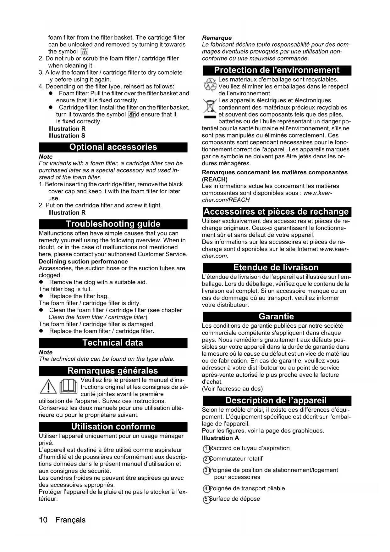 Illustration R Troubleshooting guide Malfunctions often have simple causes that you can remedy yourself using the following overview. When in doubt, or in the case of malfunctions not mentioned here, please contact your authorised Customer Service. Declining suction performance Accessories, the suction hose or the suction tubes are clogged. Remove the clog with a suitable aid. The filter bag is full. Replace the filter bag. The foam filter / cartridge filter is dirty. Clean the foam filter / cartridge filter (see chapter Clean the foam filter / cartridge filter). The foam filter / cartridge filter is damaged. Replace the foam filter / cartridge filter. Technical data Note The technical data can be found on the type plate. Remarques générales Veuillez lire le présent le manuel d'ins- tructions original et les consignes de sé- curité jointes avant la première utilisation de l'appareil. Suivez ces instructions. Conservez les deux manuels pour une utilisation ulté- rieure ou pour le propriétaire suivant. Utilisation conforme Utiliser l'appareil uniquement pour un usage ménager privé. L’appareil est destiné à être utilisé comme aspirateur d’humidité et de poussières conformément aux descrip- tions données dans le présent manuel d’utilisation et aux consignes de sécurité. Les cendres froides ne peuvent être aspirées qu’avec des accessoires appropriés. Protéger l’appareil de la pluie et ne pas le stocker à l’ex- térieur. Remarque Le fabricant décline toute responsabilité pour des dom- mages éventuels provoqués par une utilisation non- conforme ou une mauvaise commande. Protection de l'environnement Les matériaux d'emballage sont recyclables. Veuillez éliminer les emballages dans le respect de l’environnement. Les appareils électriques et électroniques contiennent des matériaux précieux recyclables et souvent des composants tels que des piles, batteries ou de l’huile représentant un danger po- tentiel pour la santé humaine et l'environnement, s'ils ne sont pas manipulés ou éliminés correctement. Ces composants sont cependant nécessaires pour le fonc- tionnement correct de l'appareil. Les appareils marqués par ce symbole ne doivent pas être jetés dans les or- dures ménagères. Remarques concernant les matières composantes (REACH) Les informations actuelles concernant les matières composantes sont disponibles sous : www.kaer- cher.com/REACH Accessoires et pièces de rechange Utiliser exclusivement des accessoires et pièces de re- change originaux. Ceux-ci garantissent le fonctionne- ment sûr et sans défaut de votre appareil. Des informations sur les accessoires et pièces de re- change sont disponibles sur le site Internet www.kaer- cher.com. Etendue de livraison L’étendue de livraison de l’appareil est illustrée sur l'em- ballage. Lors du déballage, vérifiez que le contenu de la livraison est complet. Si un accessoire manque ou en cas de dommage dû au transport, veuillez informer votre distributeur. Garantie Les conditions de garantie publiées par notre société commerciale compétente s'appliquent dans chaque pays. Nous remédions gratuitement aux défauts pos- sibles sur votre appareil dans la durée de garantie dans la mesure où la cause du défaut est un vice de matériau ou de fabrication. En cas de garantie, veuillez vous adresser à votre distributeur ou au point de service après-vente autorisé le plus proche avec la facture d'achat. (Voir l'adresse au dos) Description de l’appareil Selon le modèle choisi, il existe des différences d’équi- pement. L’équipement spécifique est décrit sur l’embal- lage de l’appareil. Pour les figures, voir la page des graphiques. Illustration A 1 Raccord de tuyau d’aspiration 2 Commutateur rotatif 3 Poignée de position de stationnement/logement pour accessoires 4 Poignée de transport pliable 5 Surface de déposeFrançais 11 6 Plaque signalétique avec caractéristiques tech- niques (p. ex. taille du réservoir) 7 Fonction soufflage 8 Fermeture du réservoir 9 Câble d’alimentation électrique avec fiche secteur 10 Logement pour les accessoires 11 Buse pour sol en position de stationnement 12 Roue directionnelle 13 Fiche de l’appareil 14 Rangement pour flexible, des deux côtés (WD 3 / KWD 3) 15 Porte-câble (WD 3 / KWD 3) 16 Sacs filtrants 17 Filtre mousse 18 Cartouche filtrante 19 Tuyau d’aspiration (WD 2 Plus / KWD 2) 20 Poignée amovible (WD 3 / KWD 3) 21 Tuyau d’aspiration avec raccord (WD 3 / KWD 3) 22 Tube d’aspiration 2 x 0,5 m 23 Suceur fentes 24 Buse pour sol 25 Adaptateur pour le raccordement des outils élec- triques Montage des roues directionnelles