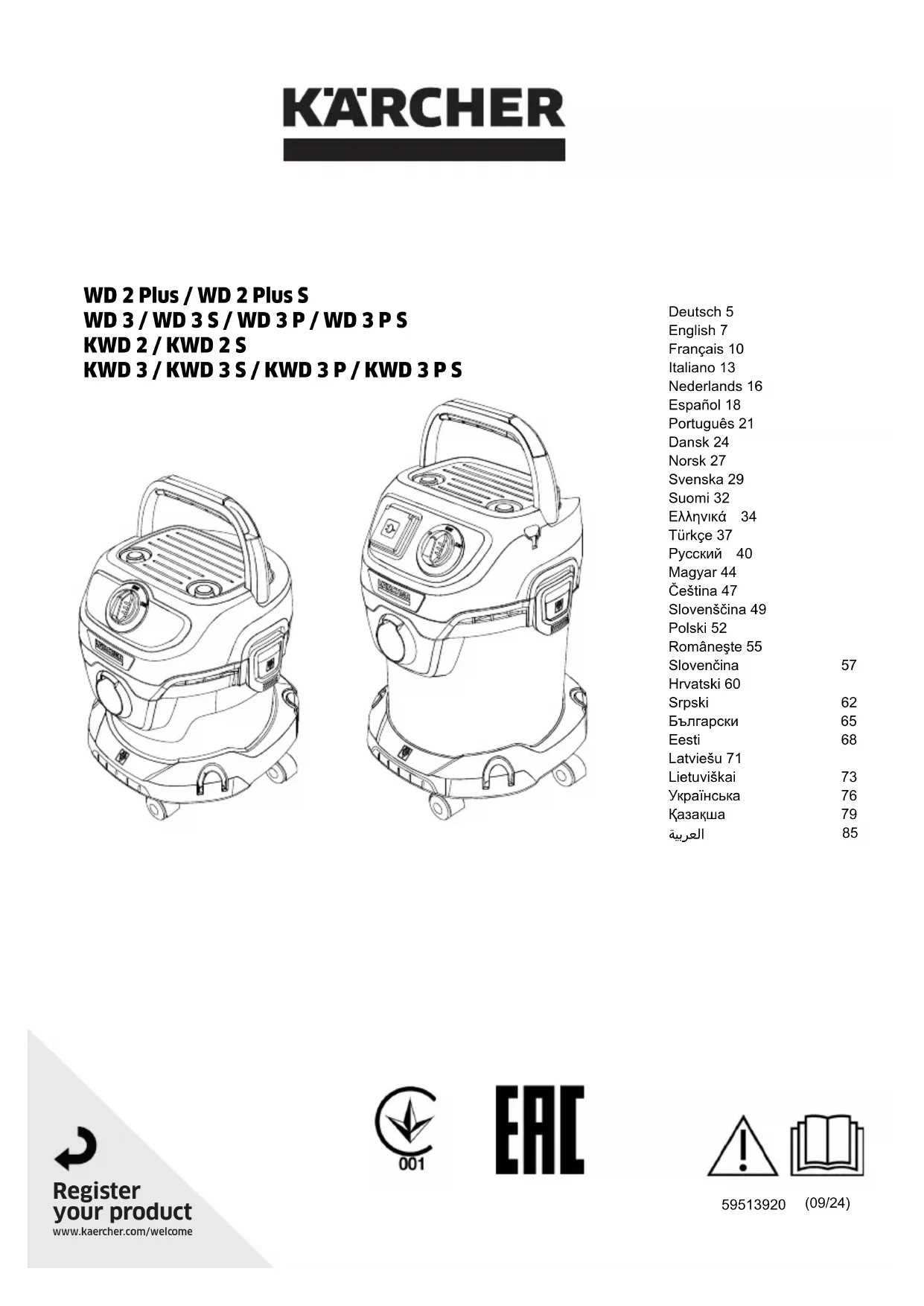 Illustration R Troubleshooting guide Malfunctions often have simple causes that you can remedy yourself using the following overview. When in doubt, or in the case of malfunctions not mentioned here, please contact your authorised Customer Service. Declining suction performance Accessories, the suction hose or the suction tubes are clogged. Remove the clog with a suitable aid. The filter bag is full. Replace the filter bag. The foam filter / cartridge filter is dirty. Clean the foam filter / cartridge filter (see chapter Clean the foam filter / cartridge filter). The foam filter / cartridge filter is damaged. Replace the foam filter / cartridge filter. Technical data Note The technical data can be found on the type plate. Remarques générales Veuillez lire le présent le manuel d'ins- tructions original et les consignes de sé- curité jointes avant la première utilisation de l'appareil. Suivez ces instructions. Conservez les deux manuels pour une utilisation ulté- rieure ou pour le propriétaire suivant. Utilisation conforme Utiliser l'appareil uniquement pour un usage ménager privé. L’appareil est destiné à être utilisé comme aspirateur d’humidité et de poussières conformément aux descrip- tions données dans le présent manuel d’utilisation et aux consignes de sécurité. Les cendres froides ne peuvent être aspirées qu’avec des accessoires appropriés. Protéger l’appareil de la pluie et ne pas le stocker à l’ex- térieur. Remarque Le fabricant décline toute responsabilité pour des dom- mages éventuels provoqués par une utilisation non- conforme ou une mauvaise commande. Protection de l'environnement Les matériaux d'emballage sont recyclables. Veuillez éliminer les emballages dans le respect de l’environnement. Les appareils électriques et électroniques contiennent des matériaux précieux recyclables et souvent des composants tels que des piles, batteries ou de l’huile représentant un danger po- tentiel pour la santé humaine et l'environnement, s'ils ne sont pas manipulés ou éliminés correctement. Ces composants sont cependant nécessaires pour le fonc- tionnement correct de l'appareil. Les appareils marqués par ce symbole ne doivent pas être jetés dans les or- dures ménagères. Remarques concernant les matières composantes (REACH) Les informations actuelles concernant les matières composantes sont disponibles sous : www.kaer- cher.com/REACH Accessoires et pièces de rechange Utiliser exclusivement des accessoires et pièces de re- change originaux. Ceux-ci garantissent le fonctionne- ment sûr et sans défaut de votre appareil. Des informations sur les accessoires et pièces de re- change sont disponibles sur le site Internet www.kaer- cher.com. Etendue de livraison L’étendue de livraison de l’appareil est illustrée sur l'em- ballage. Lors du déballage, vérifiez que le contenu de la livraison est complet. Si un accessoire manque ou en cas de dommage dû au transport, veuillez informer votre distributeur. Garantie Les conditions de garantie publiées par notre société commerciale compétente s'appliquent dans chaque pays. Nous remédions gratuitement aux défauts pos- sibles sur votre appareil dans la durée de garantie dans la mesure où la cause du défaut est un vice de matériau ou de fabrication. En cas de garantie, veuillez vous adresser à votre distributeur ou au point de service après-vente autorisé le plus proche avec la facture d'achat. (Voir l'adresse au dos) Description de l’appareil Selon le modèle choisi, il existe des différences d’équi- pement. L’équipement spécifique est décrit sur l’embal- lage de l’appareil. Pour les figures, voir la page des graphiques. Illustration A 1 Raccord de tuyau d’aspiration 2 Commutateur rotatif 3 Poignée de position de stationnement/logement pour accessoires 4 Poignée de transport pliable 5 Surface de déposeFrançais 11 6 Plaque signalétique avec caractéristiques tech- niques (p. ex. taille du réservoir) 7 Fonction soufflage 8 Fermeture du réservoir 9 Câble d’alimentation électrique avec fiche secteur 10 Logement pour les accessoires 11 Buse pour sol en position de stationnement 12 Roue directionnelle 13 Fiche de l’appareil 14 Rangement pour flexible, des deux côtés (WD 3 / KWD 3) 15 Porte-câble (WD 3 / KWD 3) 16 Sacs filtrants 17 Filtre mousse 18 Cartouche filtrante 19 Tuyau d’aspiration (WD 2 Plus / KWD 2) 20 Poignée amovible (WD 3 / KWD 3) 21 Tuyau d’aspiration avec raccord (WD 3 / KWD 3) 22 Tube d’aspiration 2 x 0,5 m 23 Suceur fentes 24 Buse pour sol 25 Adaptateur pour le raccordement des outils élec- triques Montage des roues directionnelles