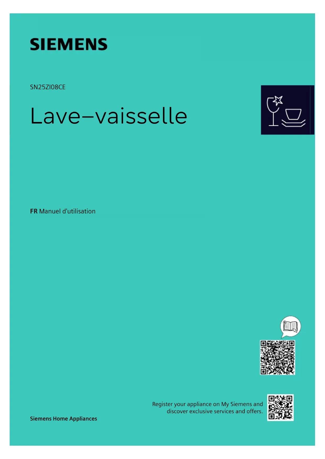 SN25ZI08CE Lave–vaisselle FR Manuel d'utilisation Siemens Home Appliances Register your appliance on My Siemens and discover exclusive services and offers.fr Table des matières Vous pouvez trouver d'autres informations et explications en ligne. Scannez le code QR sur la page de titre. Table des matièresTable des matières 1 Sécurité ........................................ 3