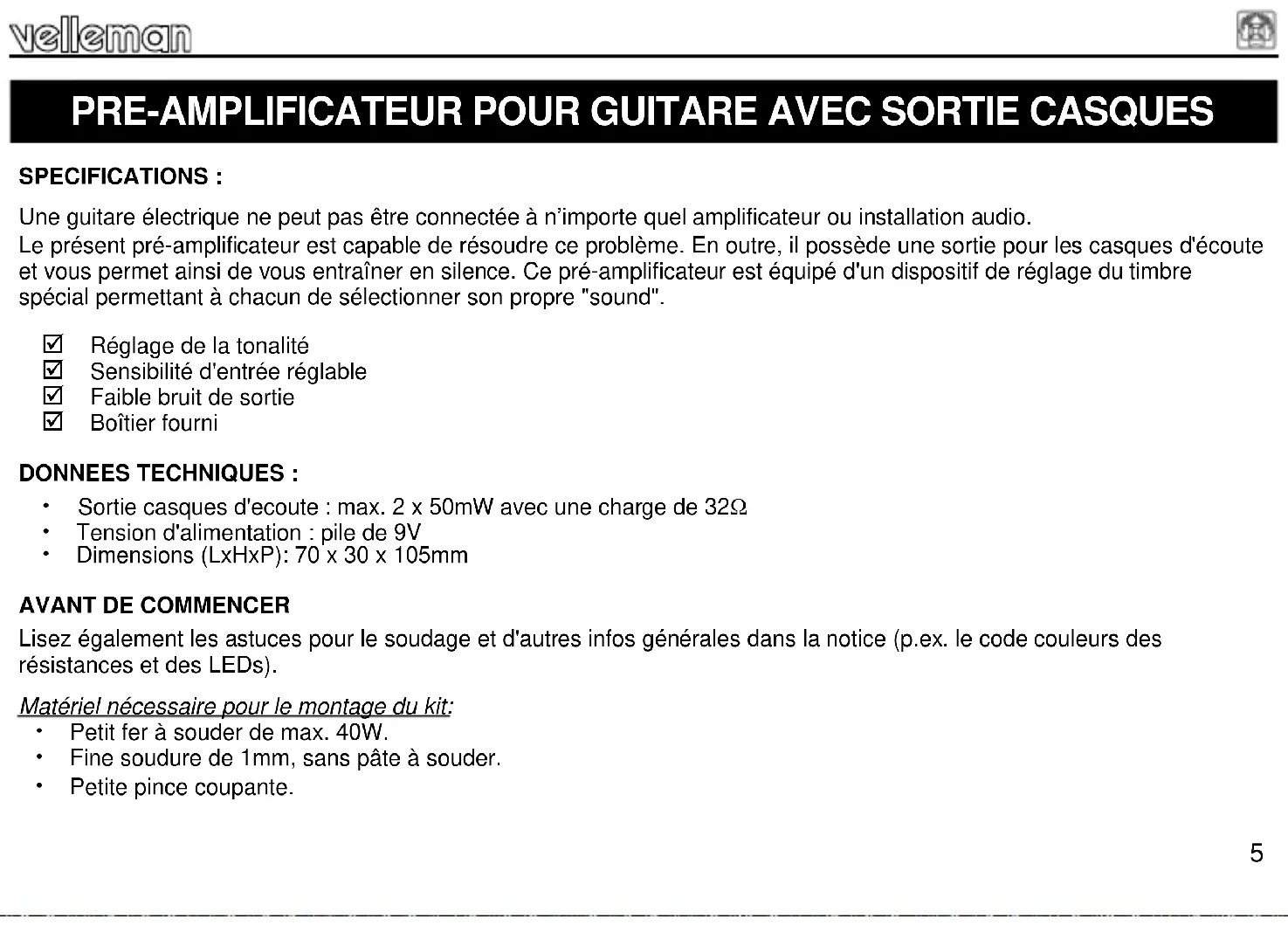 SPECIFICATIONS : Une guitare électrique ne peut pas être connectée à n’importe quel amplificateur ou installation audio. Le présent pré-amplificateur est capable de résoudre ce problème. En outre, il possède une sortie pour les casques d'écoute et vous permet ainsi de vous entraîner en silence. Ce pré-amplificateur est équipé d'un dispositif de réglage du timbre spécial permettant à chacun de sélectionner son propre "sound". Réglage de la tonalité Sensibilité d'entrée réglable Faible bruit de sortie Boîtier fourni DONNEES TECHNIQUES : Sortie casques d'ecoute : max. 2 x 50mW avec une charge de 32 Tension d'alimentation : pile de 9V Dimensions (LxHxP): 70 x 30 x 105mm