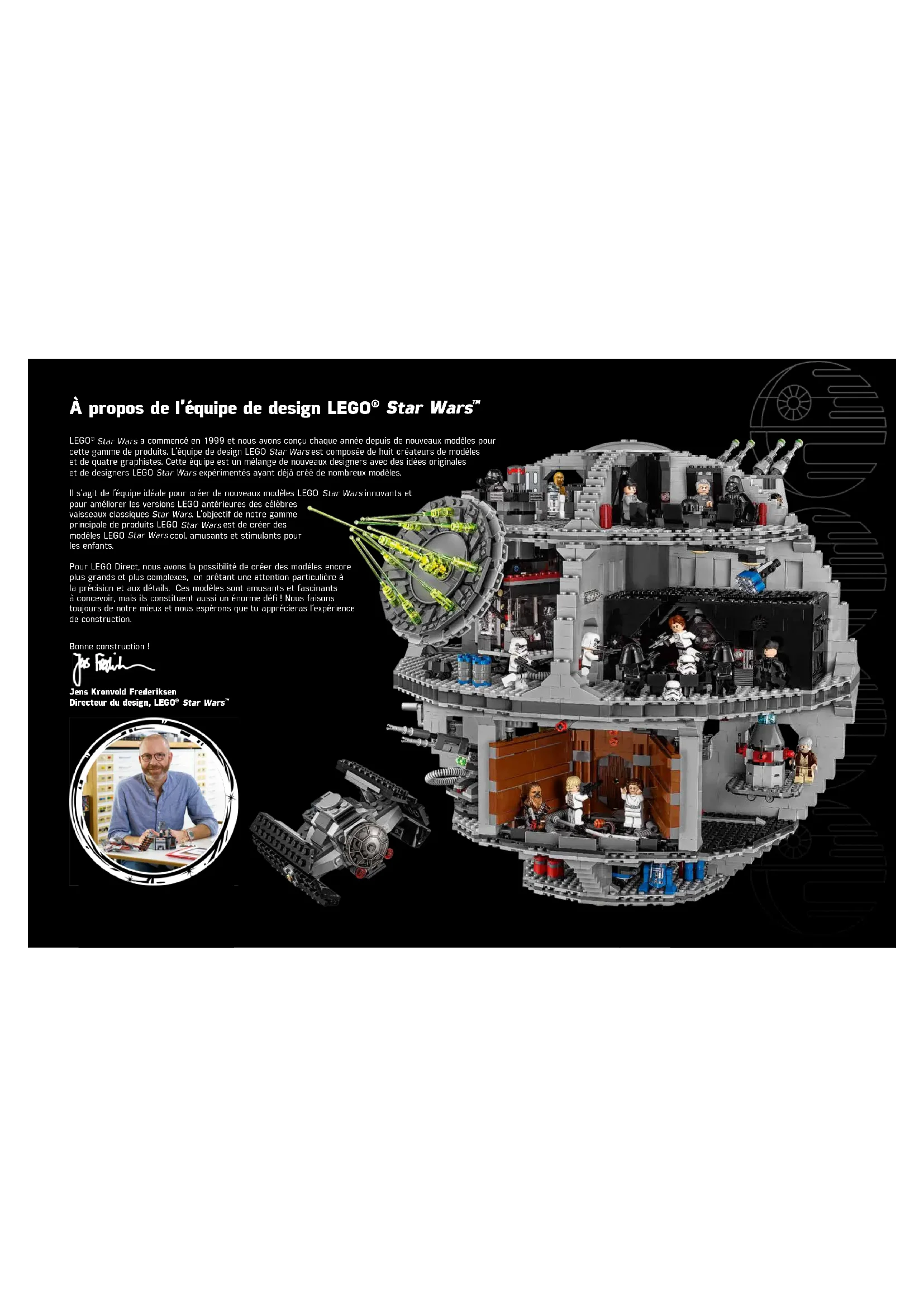 Star Wars a commencé en 1999 et nous avons conçu chaque année depuis de nouveaux modèles pour cette gamme de produits. L’équipe de design LEGO Star Wars est composée de huit créateurs de modèles et de quatre graphistes. Cette équipe est un mélange de nouveaux designers avec des idées originales et de designers LEGO Star Wars expérimentés ayant déjà créé de nombreux modèles.Il s’agit de l’équipe idéale pour créer de nouveaux modèles LEGO Star Wars innovants et pour améliorer les versions LEGO antérieures des célèbres vaisseaux classiques Star Wars . L’objectif de notre gamme principale de produits LEGO Star Wars est de créer des modèles LEGO Star Wars cool, amusants et stimulants pour les enfants.Pour LEGO Direct, nous avons la possibilité de créer des modèles encore plus grands et plus complexes, en prêtant une attention particulière à la précision et aux détails. Ces modèles sont amusants et fascinants à concevoir, mais ils constituent aussi un énorme défi ! Nous faisons toujours de notre mieux et nous espérons que tu apprécieras l’expérience de construction.Bonne construction ! Jens Kronvold Frederiksen Directeur du design, LEGO