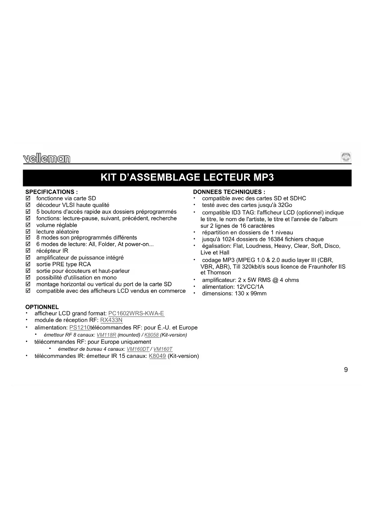 SPECIFICATIONS : fonctionne via carte SD décodeur VLSI haute qualité 5 boutons d'accès rapide aux dossiers préprogrammés fonctions: lecture-pause, suivant, précédent, recherche volume réglable lecture aléatoire 8 modes son préprogrammés différents 6 modes de lecture: All, Folder, At power-on... récépteur IR amplificateur de puissance intégré sortie PRE type RCA sortie pour écouteurs et haut-parleur possibilité d'utilisation en mono montage horizontal ou vertical du port de la carte SD compatible avec des afficheurs LCD vendus en commerce DONNEES TECHNIQUES : compatible avec des cartes SD et SDHC testé avec des cartes jusqu'à 32Go compatible ID3 TAG: l'afficheur LCD (optionnel) indique le titre, le nom de l'artiste, le titre et l'année de l'album sur 2 lignes de 16 caractères répartition en dossiers de 1 niveau jusqu'à 1024 dossiers de 16384 fichiers chaque égalisation: Flat, Loudness, Heavy, Clear, Soft, Disco, Live et Hall codage MP3 (MPEG 1.0 & 2.0 audio layer III (CBR, VBR, ABR), Till 320kbit/s sous licence de Fraunhofer IIS et Thomson amplificateur: 2 x 5W RMS @ 4 ohms alimentation: 12VCC/1A dimensions: 130 x 99mm OPTIONNEL afficheur LCD grand format: PC1602WRS-KWA-E module de réception RF: RX433N alimentation: PS1210télécommandes RF: pour É.-U. et Europe émetteur RF 8 canaux: VM118R (mounted) / K8058 (Kit-version) télécommandes RF: pour Europe uniquement émetteur de bureau 4 canaux: VM160DT / VM160T télécommandes IR: émetteur IR 15 canaux: K8049 (Kit-version)10