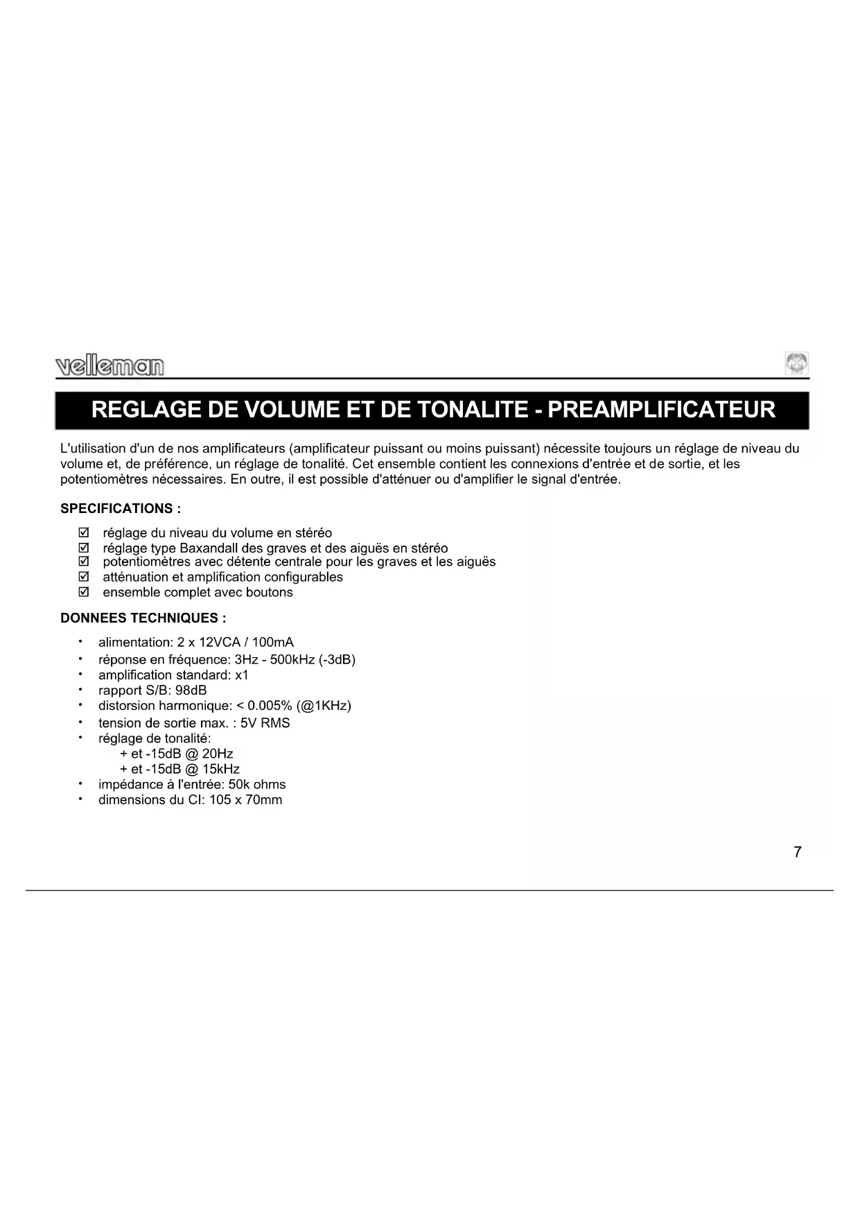 Monteer de transformator zo ver mogelijk van de schakeling vandaan, dit om brom instraling tegen te gaan. Het is best om deze schakeling altijd onder spanning te laten staan, enkel bij langdurig niet gebruik kan men de netspanning uitschakelen, altijd eerst de eindversterker uitschakelen dan pas de voorversterker.7 L'utilisation d'un de nos amplificateurs (amplificateur puissant ou moins puissant) nécessite toujours un réglage de niveau du volume et, de préférence, un réglage de tonalité. Cet ensemble contient les connexions d'entrée et de sortie, et les potentiomètres nécessaires. En outre, il est possible d'atténuer ou d'amplifier le signal d'entrée. SPECIFICATIONS : réglage du niveau du volume en stéréo réglage type Baxandall des graves et des aiguës en stéréo potentiomètres avec détente centrale pour les graves et les aiguës atténuation et amplification configurables ensemble complet avec boutons DONNEES TECHNIQUES : alimentation: 2 x 12VCA / 100mA réponse en fréquence: 3Hz - 500kHz (-3dB) amplification standard: x1 rapport S/B: 98dB distorsion harmonique: < 0.005% (@1KHz) tension de sortie max. : 5V RMS réglage de tonalité: + et -15dB @ 20Hz + et -15dB @ 15kHz impédance à l'entrée: 50k ohms dimensions du CI: 105 x 70mm REGLAGE DE VOLUME ET DE TONALITE - PREAMPLIFICATEUR8 La plupart des composants ont été placés mécaniquement dans l'ordre correct sur une bande pour votre facilité et pour éviter des erreurs. Retirez les composants un par un de la bande.