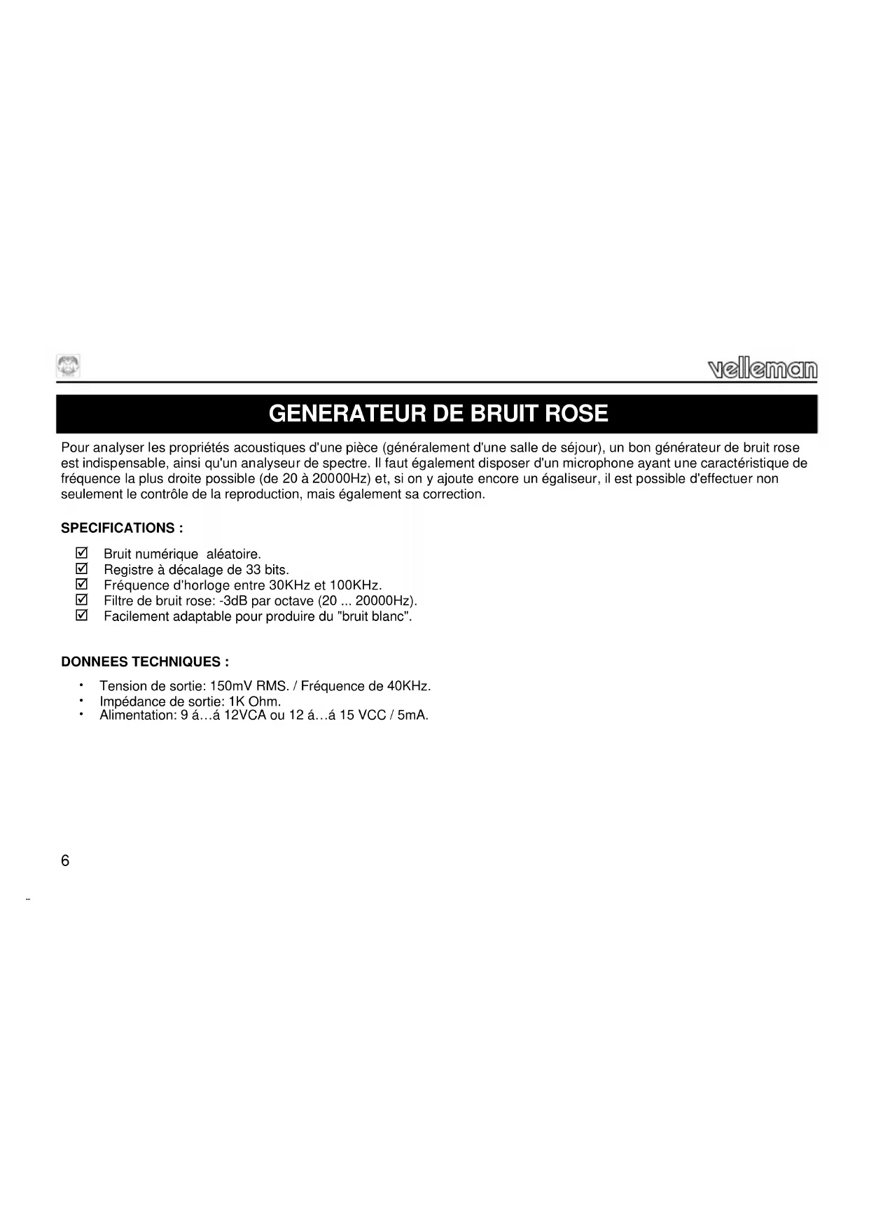 Pour analyser les propriétés acoustiques d'une pièce (généralement d'une salle de séjour), un bon générateur de bruit rose est indispensable, ainsi qu'un analyseur de spectre. Il faut également disposer d'un microphone ayant une caractéristique de fréquence la plus droite possible (de 20 à 20000Hz) et, si on y ajoute encore un égaliseur, il est possible d'effectuer non seulement le contrôle de la reproduction, mais également sa correction. SPECIFICATIONS : Bruit numérique aléatoire. Registre à décalage de 33 bits. Fréquence d'horloge entre 30KHz et 100KHz. Filtre de bruit rose: -3dB par octave (20 ... 20000Hz). Facilement adaptable pour produire du "bruit blanc".