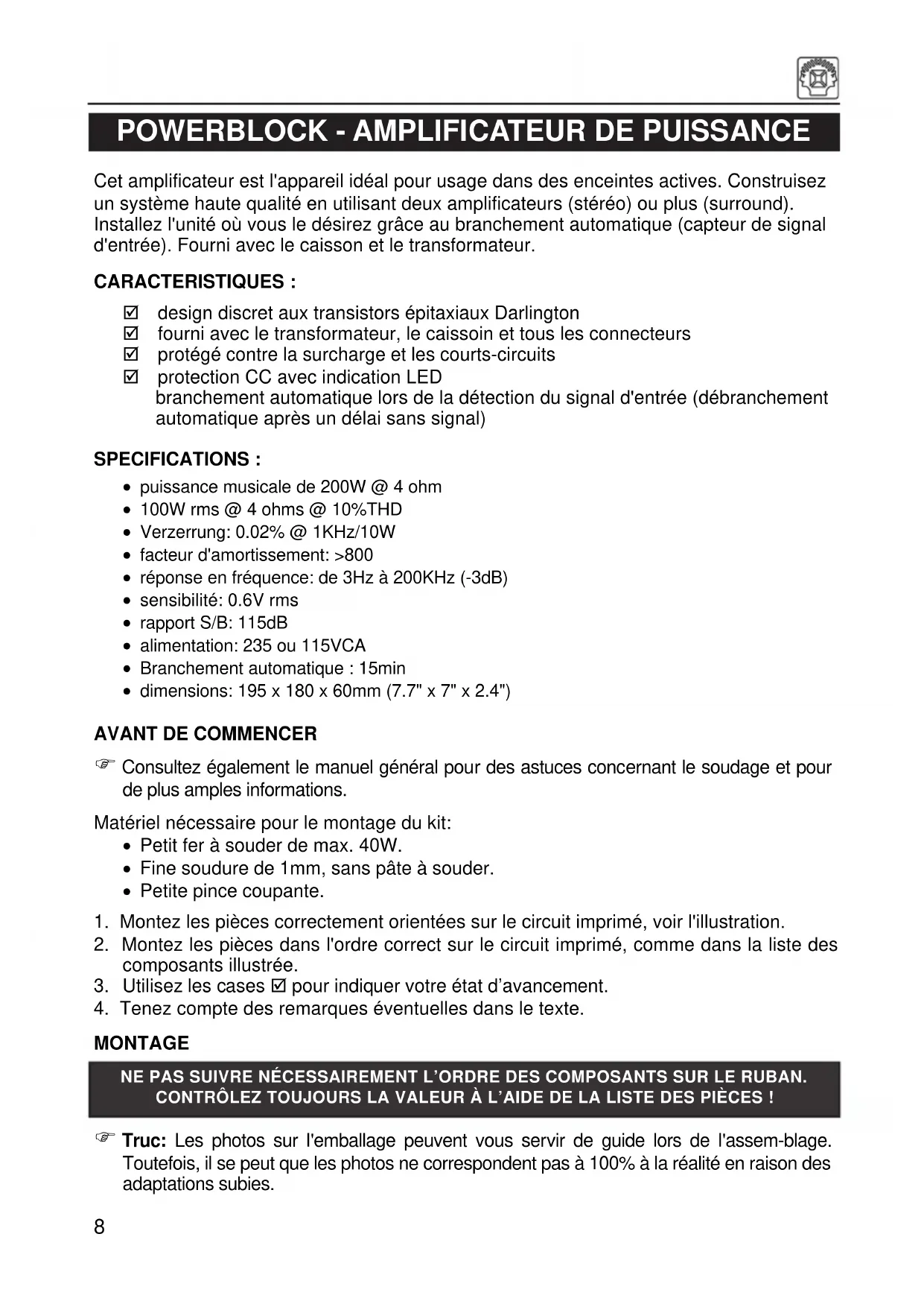 uitgeschakeld. Wanneer de versterker een fout heeft gedetecteerd, door bijvoorbeeld te hoge extreme geluidsignalen of door een fout in de versterker, reset de versterker door de versterker uit te schakelen, wacht 10 seconden en schakel daarna opnieuw in. Controleer het circuit op fouten mocht de fout zich niet herstellen.8 Cet amplificateur est l'appareil idéal pour usage dans des enceintes actives. Construisez un système haute qualité en utilisant deux amplificateurs (stéréo) ou plus (surround). Installez l'unité où vous le désirez grâce au branchement automatique (capteur de signal d'entrée). Fourni avec le caisson et le transformateur. CARACTERISTIQUES : design discret aux transistors épitaxiaux Darlington fourni avec le transformateur, le caissoin et tous les connecteurs protégé contre la surcharge et les courts-circuits protection CC avec indication LED branchement automatique lors de la détection du signal d'entrée (débranchement automatique après un délai sans signal) SPECIFICATIONS :