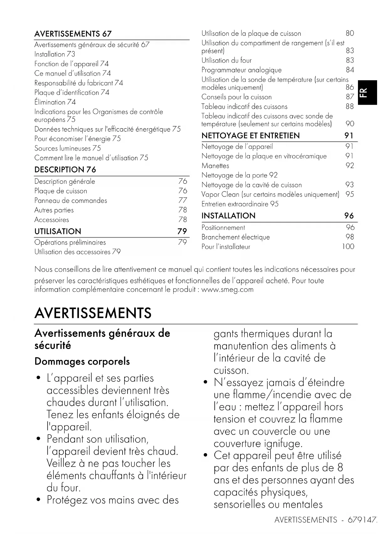 Nettoyage de l’appareil 91Nettoyage de la plaque en vitrocéramique 91Manettes 92Nettoyage de la porte 92Nettoyage de la cavité de cuisson 93Vapor Clean (sur certains modèles uniquement) 95Entretien extraordinaire 95 INSTALLATION 96 Positionnement 96Branchement électrique 98Pour l’installateur 100 Nous conseillons de lire attentivement ce manuel qui contient toutes les indications nécessaires pour préserver les caractéristiques esthétiques et fonctionnelles de l’appareil acheté. Pour toute information complémentaire concernant le produit : www.smeg.com AVERTISSEMENTS Avertissements généraux de sécurité Dommages corporels