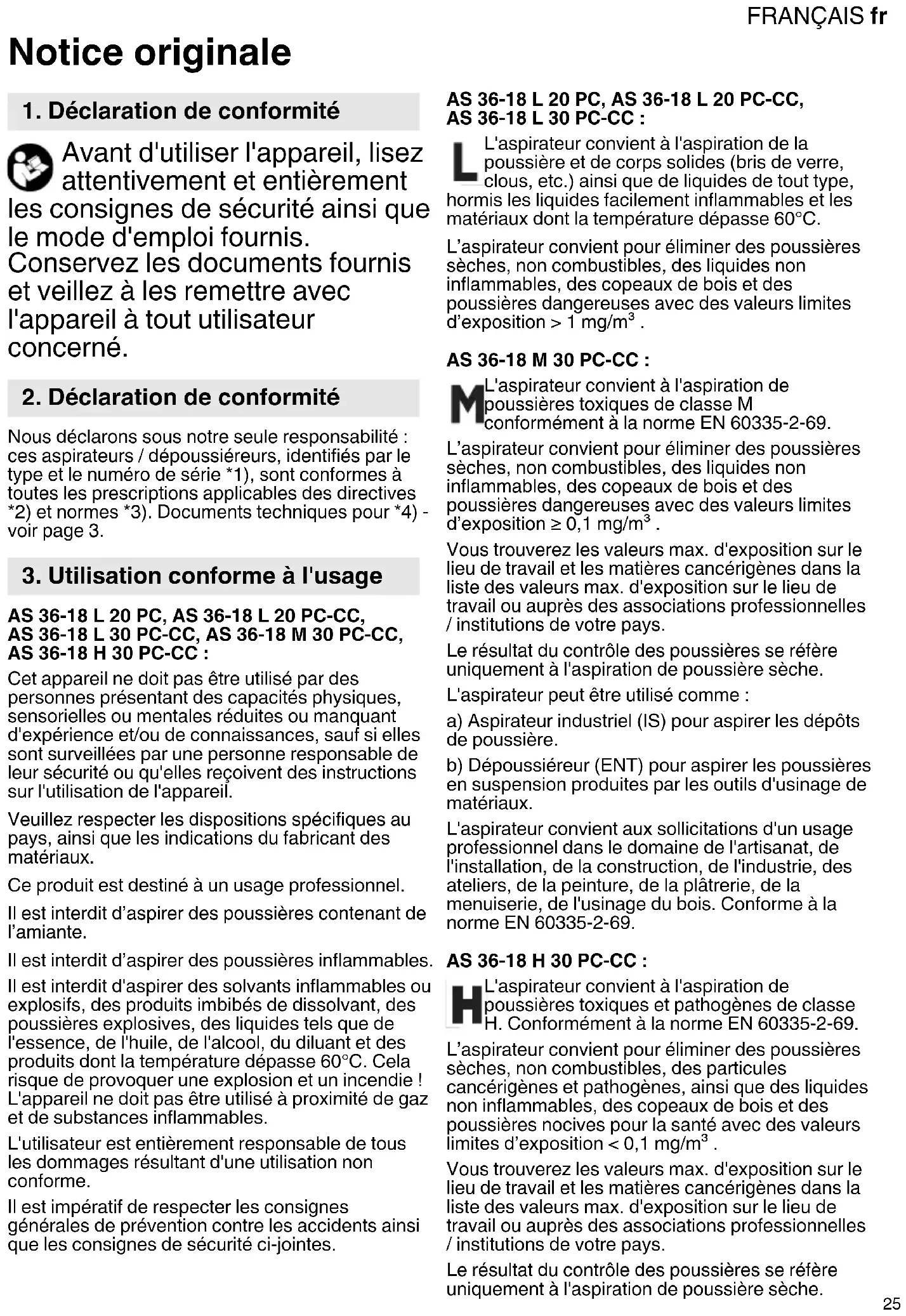 Notice originale Avant d'utiliser l'appareil, lisez attentivement et entièrement les consignes de sécurité ainsi que le mode d'emploi fournis. Conservez les documents fournis et veillez à les remettre avec l'appareil à tout utilisateur concerné. Nous déclarons sous notre seule responsabilité : ces aspirateurs / dépoussiéreurs, identifiés par le type et le numéro de série *1), sont conformes à toutes les prescriptions applicables des directives *2) et normes *3). Documents techniques pour *4) - voir page 3. AS 36-18 L 20 PC, AS 36-18 L 20 PC-CC, AS 36-18 L 30 PC-CC, AS 36-18 M 30 PC-CC, AS 36-18 H 30 PC-CC : Cet appareil ne doit pas être utilisé par des personnes présentant des capacités physiques, sensorielles ou mentales réduites ou manquant d'expérience et/ou de connaissances, sauf si elles sont surveillées par une personne responsable de leur sécurité ou qu'elles reçoivent des instructions sur l'utilisation de l'appareil. Veuillez respecter les dispositions spécifiques au pays, ainsi que les indications du fabricant des matériaux. Ce produit est destiné à un usage professionnel. Il est interdit d’aspirer des poussières contenant de l’amiante. Il est interdit d’aspirer des poussières inflammables. Il est interdit d'aspirer des solvants inflammables ou explosifs, des produits imbibés de dissolvant, des poussières explosives, des liquides tels que de l'essence, de l'huile, de l'alcool, du diluant et des produits dont la température dépasse 60°C. Cela risque de provoquer une explosion et un incendie ! L'appareil ne doit pas être utilisé à proximité de gaz et de substances inflammables. L'utilisateur est entièrement responsable de tous les dommages résultant d'une utilisation non conforme. Il est impératif de respecter les consignes générales de prévention contre les accidents ainsi que les consignes de sécurité ci-jointes. AS 36-18 L 20 PC, AS 36-18 L 20 PC-CC, AS 36-18 L 30 PC-CC : L'aspirateur convient à l'aspiration de la poussière et de corps solides (bris de verre, clous, etc.) ainsi que de liquides de tout type, hormis les liquides facilement inflammables et les matériaux dont la température dépasse 60°C. L’aspirateur convient pour éliminer des poussières sèches, non combustibles, des liquides non inflammables, des copeaux de bois et des poussières dangereuses avec des valeurs limites d’exposition > 1 mg/m³ . AS 36-18 M 30 PC-CC : L'aspirateur convient à l'aspiration de poussières toxiques de classe M conformément à la norme EN 60335-2-69. L’aspirateur convient pour éliminer des poussières sèches, non combustibles, des liquides non inflammables, des copeaux de bois et des poussières dangereuses avec des valeurs limites d’exposition ≥ 0,1 mg/m³ . Vous trouverez les valeurs max. d'exposition sur le lieu de travail et les matières cancérigènes dans la liste des valeurs max. d'exposition sur le lieu de travail ou auprès des associations professionnelles / institutions de votre pays. Le résultat du contrôle des poussières se réfère uniquement à l'aspiration de poussière sèche. L'aspirateur peut être utilisé comme : a) Aspirateur industriel (IS) pour aspirer les dépôts de poussière. b) Dépoussiéreur (ENT) pour aspirer les poussières en suspension produites par les outils d'usinage de matériaux. L'aspirateur convient aux sollicitations d'un usage professionnel dans le domaine de l'artisanat, de l'installation, de la construction, de l'industrie, des ateliers, de la peinture, de la plâtrerie, de la menuiserie, de l'usinage du bois. Conforme à la norme EN 60335-2-69. AS 36-18 H 30 PC-CC : L'aspirateur convient à l'aspiration de poussières toxiques et pathogènes de classe H. Conformément à la norme EN 60335-2-69. L’aspirateur convient pour éliminer des poussières sèches, non combustibles, des particules cancérigènes et pathogènes, ainsi que des liquides non inflammables, des copeaux de bois et des poussières nocives pour la santé avec des valeurs limites d’exposition < 0,1 mg/m³ . Vous trouverez les valeurs max. d'exposition sur le lieu de travail et les matières cancérigènes dans la liste des valeurs max. d'exposition sur le lieu de travail ou auprès des associations professionnelles / institutions de votre pays. Le résultat du contrôle des poussières se réfère uniquement à l'aspiration de poussière sèche.