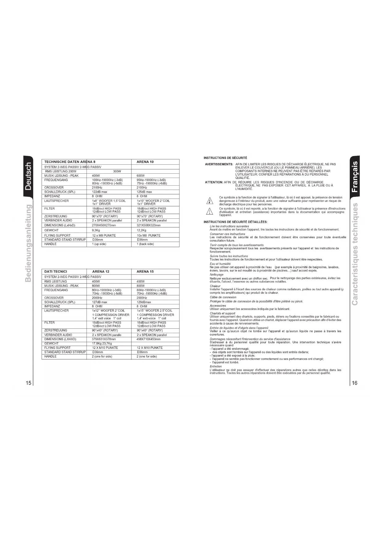 Das Hochtonhorn der ARENA Lautsprecherserie ist drehbar, so dass man bei vertikaler und horizontaler Anwendung, immer das gewünscht Abstrahlverhalten bekommt. Wenn man den Schallabstrahlungswinkel des Hornes ändern möchte, soll man (BILD 5): - die Befestigungsschrauben des Gitters herausschrauben - das vordere Schutzgitter entfernen, indem man einen leichten Druck auf einer Seite ausübt und indem man es von ihren Vertiefungen aufhebt - die acht Befestigungsschrauben des Hornes herausdrehen - das Horn in die gewünschte Richtung drehen (den Satz des Hornes nie aus dem Lautsprecher herausnehmen) - die Befestigungsschrauben des Hornes wiedereinschrauben - das Frontgitter wieder in die dazu bestimmten seitlichen Vertiefungen einlegen und die Schrauben des Netzes wiedereindrehen. Werkseitig ist das Hochtonhorn mit 90° horizontal. DeutschDeutsch BedienungsanleitungBedienungsanleitung DeutschDeutsch BedienungsanleitungBedienungsanleitungINSTRUCTIONS DE SÉCURITÉ AVERTISSEMENTS: AFIN DE LIMITER LES RISQUES DE DÉCHARGE ÉLECTRIQUE, NE PAS ENLEVER LE COUVERCLE (OU LE PANNEAU ARRIÈRE). LES COMPOSANTS INTERNES NE PEUVENT PAS ÊTRE RÉPARÉS PAR L'UTILISATEUR; CONFIER LES RÉPARATIONS À DU PERSONNEL QUALIFIÉ. ATTENTION: AFIN DE RÉDUIRE LES RISQUES D'INCENDIE OU DE DÉCHARGE ÉLECTRIQUE, NE PAS EXPOSER CET APPAREIL À LA PLUIE OU À L'HUMIDITÉ. Ce symbole a la fonction de signaler à l'utilisateur, là où il est apposé, la présence de tension dangereuse à l'intérieur du produit, avec une valeur suffisante pour représenter un risque de décharge électrique pour les personnes. Ce symbole, là où il est reporté, a la fonction de signaler à l'utilisateur la présence d'instructions d'utilisation et entretien (assistance) importantes dans la documentation qui accompagne l'appareil. INSTRUCTIONS DE SÉCURITÉ DÉTAILLÉES: Avant de mettre en fonction l'appareil, lire toutes les instructions de sécurité et de fonctionnement. Conserver ces instructions Les instructions de sécurité et de fonctionnement doivent être conservées pour toute éventuelle consultation future. Respecter scrupuleusement tous les avertissements présents sur l'appareil et les instructions de fonctionnement. Toutes les instructions de fonctionnement et pour l'utilisateur doivent être respectées. Eau et humidité (par exemple à proximité de baignoires, lavabos, éviers, lavoirs, sur le sol mouillé ou à proximité de piscines…) sauf accord expés. Nettoyage Pour le nettoyange des parties extérieures, évitez les diluants, l’alcool, l’essence ou autres substances volatiles. Chaleur Câble de connexion Protéger le câble de connexion de la possibilité d'être piétiné ou pincé. Accessoires Chariots et support Entrée de liquides et d'objets dans l'appareil Veiller à ce qu'aucun objet ne tombe sur l'appareil et qu'aucun liquide ne passe à travers les ouvertures. Dommages nécessitant l'intervention du service d'assistance - des objets sont tombés sur l'appareil ou des liquides sont entrés dedans; - l'appareil a été exposé à la pluie; - l'appareil ne semble pas fonctionner correctement ou ses performances ont changé; - l'appareil est tombé. Entretien L'utilisateur ne doit pas essayer d'effectuer des réparations autres que celles décrites dans les instructions. Toutes les autres réparations doivent être exécutées par du personnel qualifié. Lire les instructions suivantes Tenir compte de tous les avertissements. Suivre toutes les instructions Ne pas utiliser cet appareil à proximité de l'eau Nettoyer exclusivement avec un chiffon sec. Installer l'appareil à l'écart des sources de chaleur comme radiateurs, poêles ou tout autre appareil (y compris les amplificateurs) qui produit de la chaleur. Utiliser uniquement les accessoires indiqués par le fabricant. Utiliser uniquement des chariots, supports, pieds, étriers ou fixations conseillés par le fabricant ou fournis avec l'appareil. Quand on utilise un chariot, déplacer l'appareil avec précaution afin d'éviter des accidents à cause de renversements. S'adresser à du personnel qualifié pour toute réparation. Une intervention technique s'avère nécessaire quand - l'appareil a été endommagé;