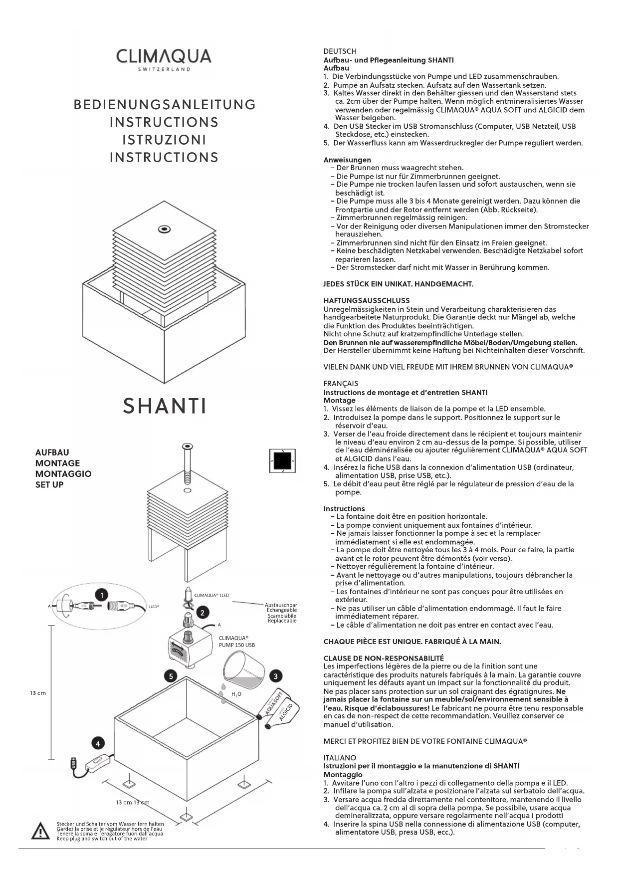 Les imperfections légères de la pierre ou de la finition sont une caractéristique des produits naturels fabriqués à la main. La garantie couvre uniquement les défauts ayant un impact sur la fonctionnalité du produit. Ne pas placer sans protection sur un sol craignant des égratignures. Ne jamais placer la fontaine sur un meuble/sol/environnement sensible à l’eau. Risque d’éclaboussures! Le fabricant ne pourra être tenu responsable en cas de non-respect de cee recommandation. Veuillez conserver ce manuel d’utilisation. MERCI ET PROFITEZ BIEN DE VOTRE FONTAINE CLIMAQUA® ITALIANO Istruzioni per il montaggio e la manutenzione di SHANTI Montaggio