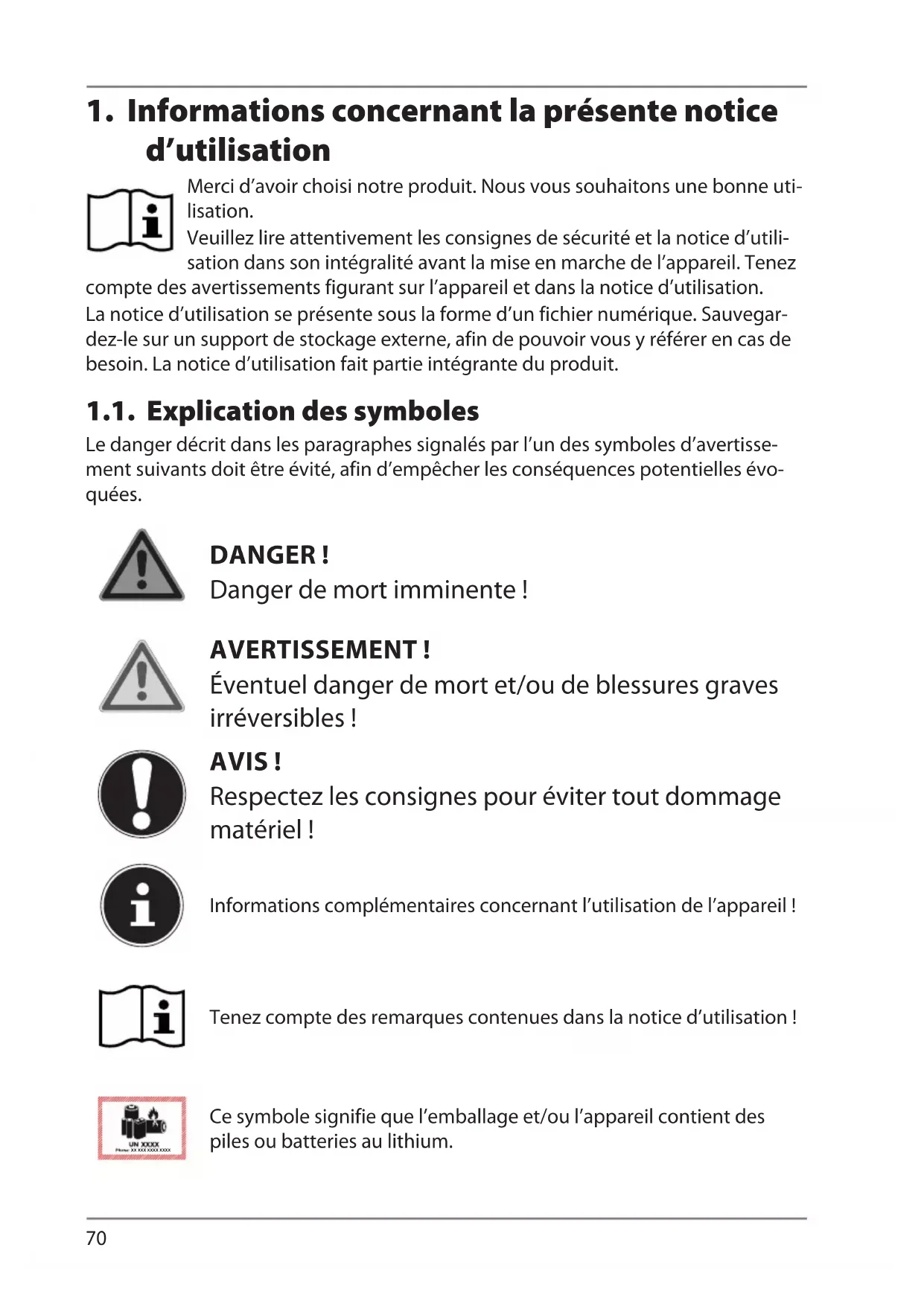 d’utilisation Merci d’avoir choisi notre produit. Nous vous souhaitons une bonne uti- lisation. Veuillez lire attentivement les consignes de sécurité et la notice d’utili- sation dans son intégralité avant la mise en marche de l’appareil. Tenez compte des avertissements figurant sur l’appareil et dans la notice d’utilisation. La notice d’utilisation se présente sous la forme d’un fichier numérique. Sauvegar- dez-le sur un support de stockage externe, afin de pouvoir vous y référer en cas de besoin. La notice d’utilisation fait partie intégrante du produit. 1.1. Explication des symboles Le danger décrit dans les paragraphes signalés par l’un des symboles d’avertisse- ment suivants doit être évité, afin d’empêcher les conséquences potentielles évo- quées. DANGER ! Danger de mort imminente ! AVERTISSEMENT ! Éventuel danger de mort et/ou de blessures graves irréversibles ! AVIS ! Respectez les consignes pour éviter tout dommage matériel ! Informations complémentaires concernant l’utilisation de l’appareil ! Tenez compte des remarques contenues dans la notice d’utilisation !