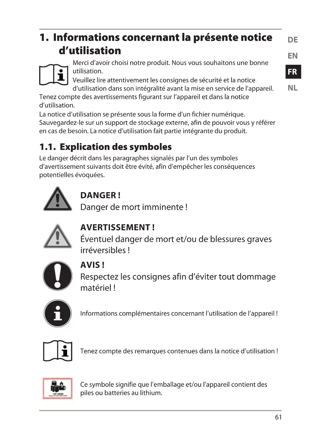 d’utilisation Merci d’avoir choisi notre produit. Nous vous souhaitons une bonne utilisation. Veuillez lire attentivement les consignes de sécurité et la notice d’utilisation dans son intégralité avant la mise en service de l’appareil. Tenez compte des avertissements figurant sur l’appareil et dans la notice d’utilisation. La notice d’utilisation se présente sous la forme d’un fichier numérique. Sauvegardez-le sur un support de stockage externe, afin de pouvoir vous y référer en cas de besoin. La notice d’utilisation fait partie intégrante du produit. 1.1. Explication des symboles Le danger décrit dans les paragraphes signalés par l’un des symboles d’avertissement suivants doit être évité, afin d’empêcher les conséquences potentielles évoquées. DANGER ! Danger de mort imminente ! AVERTISSEMENT ! Éventuel danger de mort et/ou de blessures graves irréversibles ! AVIS ! Respectez les consignes afin d’éviter tout dommage matériel ! Informations complémentaires concernant l’utilisation de l’appareil ! Tenez compte des remarques contenues dans la notice d’utilisation !