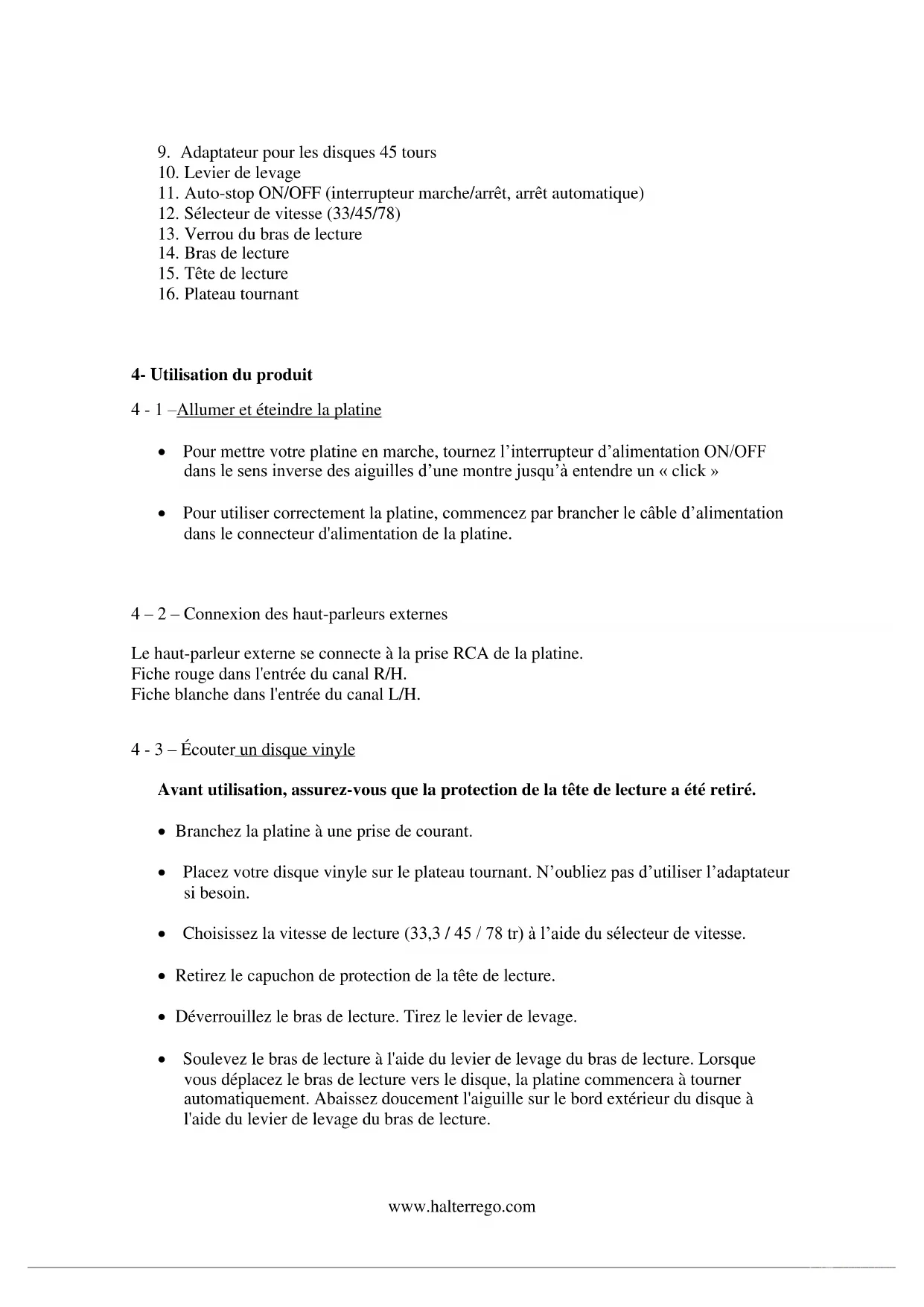 - Aucune pièce de cet appareil ne peut être réparée ou remplacée par l’utilisateur. Confiez les réparations et l’entretien exclusivement à un personnel qualifié. Tout démontage de l’appareil entraînera l’annulation de la garantie. - Vérifiez que la tension d’alimentation indiquée sur la plaque signalétique de l’appareil corresponde bien à celle de votre installation électrique. - L’appareil est uniquement destiné à une utilisation en intérieur. - Veillez à installer l’appareil sur une surface plane et stable (évitez, en particulier, de le placer sur des tissus ou des moquettes). - Placez le produit dans un endroit sec, à l’abri de l’humidité et de la condensation. - Evitez les projections d’eau ou autres liquides. - Veuillez ne pas exposer l’appareil à la lumière directe du soleil et à la poussière. - N’installez pas cet appareil dans un espace restreint comme une bibliothèque, derrière des rideaux etc. afin de permettre une ventilation suffisante. - Débrancher le produit en cas de non-utilisation du réseau de distribution d'énergie. La prise du réseau d’alimentation sert de dispositif de sectionnement et celle-ci doit être aisément accessible. - Débranchez l’appareil avant tout nettoyage. Nettoyez-le uniquement à l’aide d’un chiffon doux et sec et évitez l’usage d’aérosols. - Nous vous conseillons de remplacer l’aiguille de la platine régulièrement (approximativement au bout de 250 heures d’écoute). - Epoussetez l’aiguille de temps en temps, en utilisant une brosse très douce avec un peu d’alcool (brossez l’aiguille d’arrière en avant directement sur la tête de lecture). Lorsque vous transportez votre platine n’oubliez pas de respecter ces précautions : - Replacez le capuchon de protection sur l’aiguille. - Verrouillez le bras de lecture à l’aide de l’attache autobloquante. Le non-respect de ces consignes pourrait endommager votre appareil. Par ailleurs cela entraînerait l’annulation de la garantie. Cela s’applique à tous les éléments contenus dans l’emballage (platine, câbles, etc). Halterrego ne saurait être tenu pour responsable d’une mauvaise utilisation du produit.