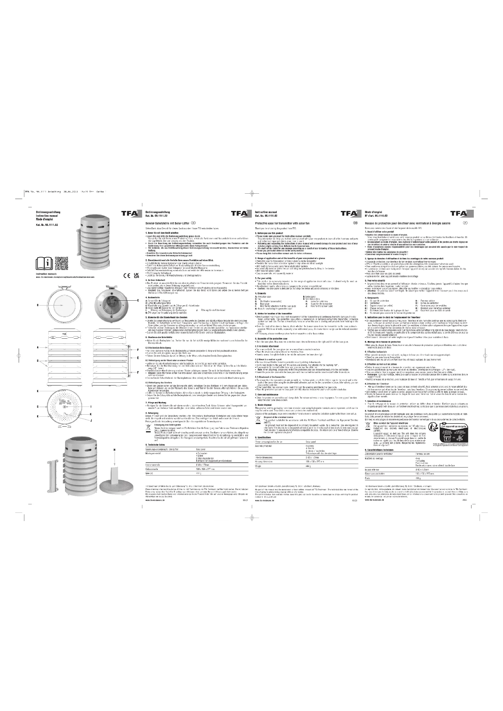 - Insert the protective case with the base plate and the attached transmitter into the wall holder from above. 6.3 Attachment of the transmitter• To ensure that the transmitter stands securely on the base plate, attach the Velcro tape to the stand and to theback of the transmitter using the double-sided adhesive tape and fix the transmitter in place. Alternatively, you canalso use the cable ties.• If the transmitter has a sensor cable, lead it through the opening provided in the base plate. • Place the protective case on the base plate with the attached transmitter and turn it counter-clockwise.7. Care and maintenance • Clean the protective case with a soft damp cloth. Do not use solvents or scouring agents. For a very good functionkeep the solar panel always clean.8. Waste disposalThis product and its packaging have been manufactured using high-grade materials and components which can berecycled and reused. This reduces waste and protects the environment. Dispose of the packaging in an environmentally friendly manner using the collection systems that have been set up.Disposal of the electrical deviceThis product is labelled in accordance with the EU Waste Electrical and Electronic Equipment Directive(WEEE). This product must not be disposed of in ordinary household waste. As a consumer, you are required totake end-of-life devices to a designated collection point for the disposal of electrical and electronic equip- ment, in order to ensure environmentally-compatible disposal. The return service is free of charge. Observe the current regulations in place!9. SpecificationsPower consumption for the fan Solar panel Assembly material 4 screws4 dowels2 pieces of cable tiesVelcro tape with double-sided tapeInterior dimensions Ø 80 x 170mmHousing dimension 139 x 150 x 227 mmWeight 444 g TFA Dostmann GmbH & Co.KG, Zum Ottersberg 12, 97877 Wertheim, GermanyNo part of this manual may be reproduced without written consent of TFA Dostmann. The technical data are correct at thetime of going to print and may change without prior notice. The latest technical data and information about this product can be found in our homepage by simply entering the productnumber in the search boxwww.tfa-dostmann.de 06/23 Housse de protection pour émetteur avec ventilateur à énergie solaire Nous vous remercions d'avoir choisi l'appareil de la société TFA. 1. Avant d'utiliser votre produit• Veuillez lire attentivement le mode d'emploi. Vous vous familiariserez ainsi avec votre nouveau produit, vous découvrirez toutes les fonctions et tous les élé-ments qui le composent et vous noterez les détails importants sur son utilisation.