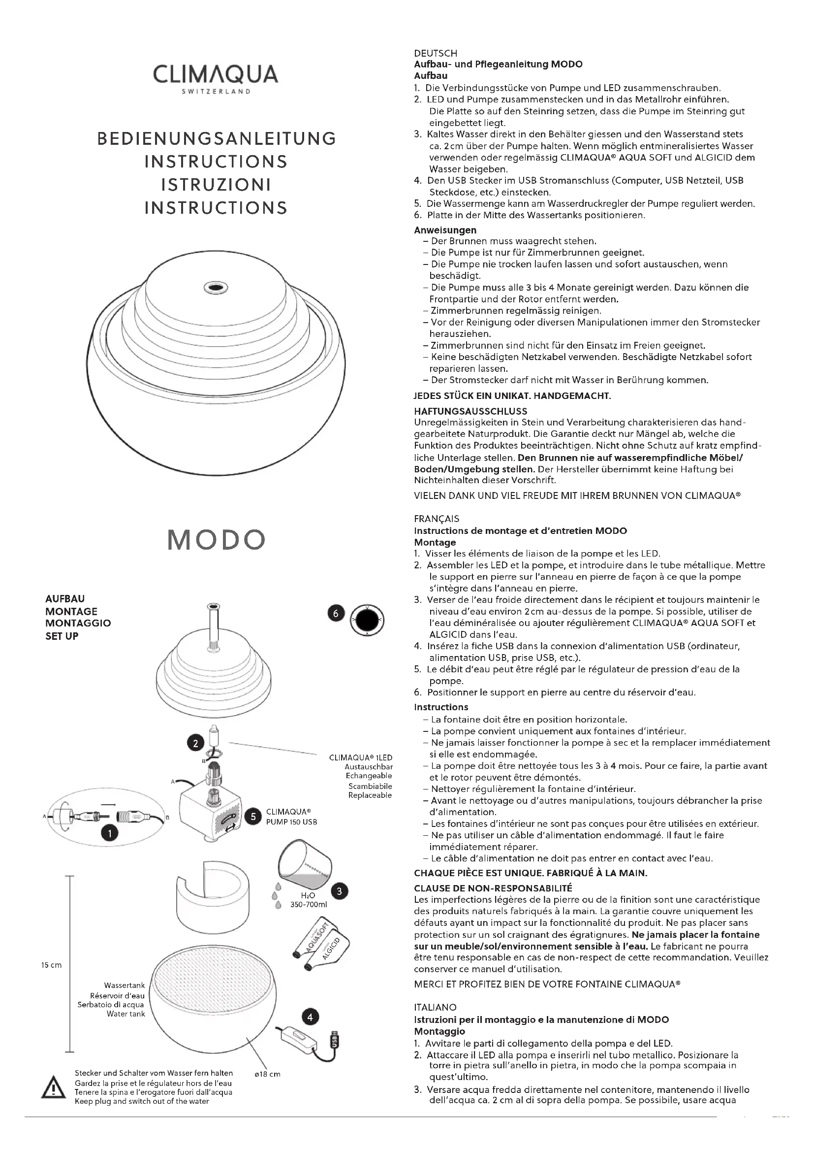 Les imperfections légères de la pierre ou de la finition sont une caractéristique des produits naturels fabriqués à la main. La garantie couvre uniquement les défauts ayant un impact sur la fonctionnalité du produit. Ne pas placer sans protection sur un sol craignant des égratignures. Ne jamais placer la fontaine sur un meuble/sol/environnement sensible à l’eau. Le fabricant ne pourra être tenu responsable en cas de non-respect de cee recommandation. Veuillez conserver ce manuel d’utilisation. MERCI ET PROFITEZ BIEN DE VOTRE FONTAINE CLIMAQUA® ITALIANO Istruzioni per il montaggio e la manutenzione di MODO Montaggio