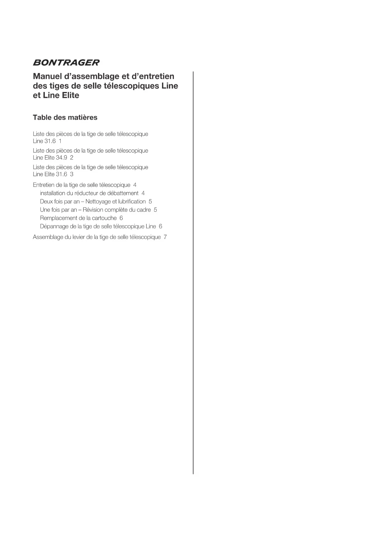 Manuel d’assemblage et d’entretien des tiges de selle télescopiques Line et Line Elite Table des matières Liste des pièces de la tige de selle télescopique Line 31.6 1 Liste des pièces de la tige de selle télescopique Line Elite 34.9 2 Liste des pièces de la tige de selle télescopique Line Elite 31.6 3 Entretien de la tige de selle télescopique 4 installation du réducteur de débattement 4 Deux fois par an – Nettoyage et lubrification 5 Une fois par an – Révision complète du cadre 5 Remplacement de la cartouche 6 Dépannage de la tige de selle télescopique Line 6 Assemblage du levier de la tige de selle télescopique 71 Liste des pièces de la tige de selle télescopique Line 31.6 Élément Description Référence 1 Cartouche W564494 (100mm) W564493 (125mm) W564492 (150mm) 2 Joint anti-poussière W554232 3 Bague supérieure