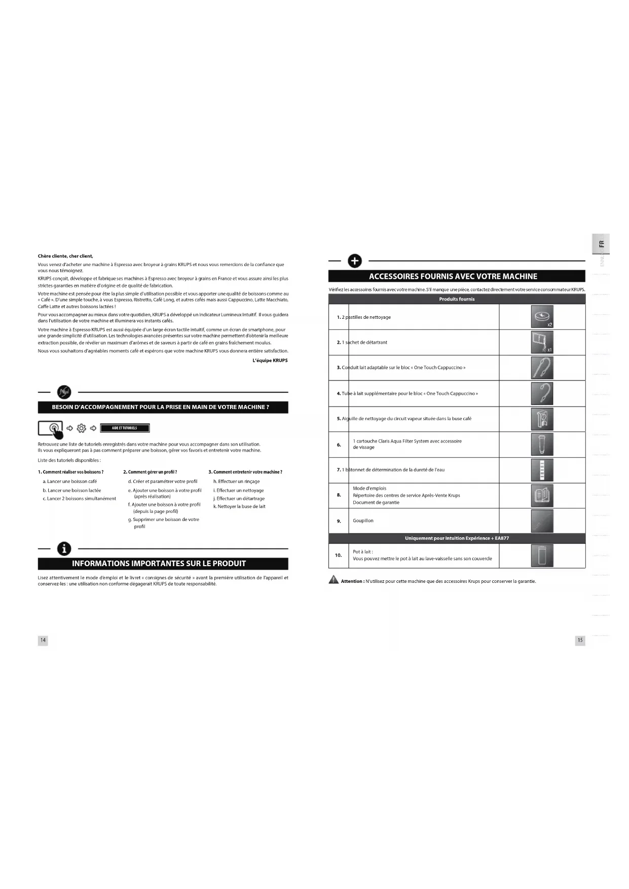 ENNLNOFIITELSKPLUKBG DEDASVESPTCSHURUROHR Chère cliente, cher client, Vous venez d’acheter une machine à Espresso avec broyeur à grains KRUPS et nous vous remercions de la conance que vous nous témoignez. KRUPS conçoit, développe et fabrique ses machines à Espresso avec broyeur à grains en France et vous assure ainsi les plus strictes garanties en matière d’origine et de qualité de fabrication. Votre machine est pensée pour être la plus simple d’utilisation possible et vous apporter une qualité de boissons comme au « Café ». D’une simple touche, à vous Espresso, Ristretto, Café Long, et autres cafés mais aussi Cappuccino, Latte Macchiato, Cae Latte et autres boissons lactées ! Pour vous accompagner au mieux dans votre quotidien, KRUPS a développé un Indicateur Lumineux Intuitif. Il vous guidera dans l’utilisation de votre machine et illuminera vos instants cafés. Votre machine à Espresso KRUPS est aussi équipée d’un large écran tactile intuitif, comme un écran de smartphone, pour une grande simplicité d’utilisation. Les technologies avancées présentes sur votre machine permettent d’obtenir la meilleure extraction possible, de révéler un maximum d’arômes et de saveurs à partir de café en grains fraîchement moulus. Nous vous souhaitons d’agréables moments café et espérons que votre machine KRUPS vous donnera entière satisfaction. L’équipe KRUPS BESOIN D’ACCOMPAGNEMENT POUR LA PRISE EN MAIN DE VOTRE MACHINE ?