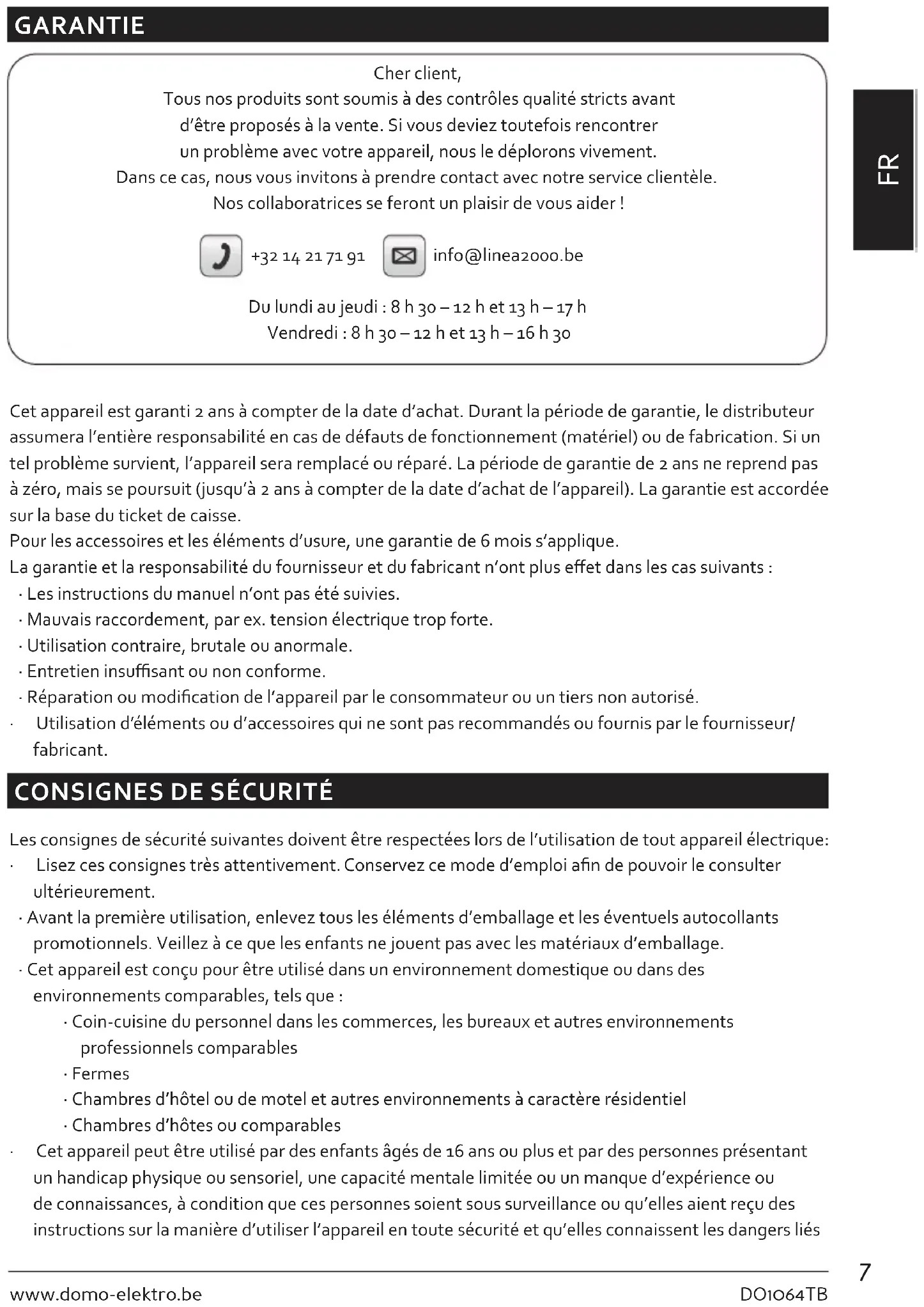 GARANTIE Cher client, Tous nos produits sont soumis à des contrôles qualité stricts avant d’être proposés à la vente. Si vous deviez toutefois rencontrer un problème avec votre appareil, nous le déplorons vivement. Dans ce cas, nous vous invitons à prendre contact avec notre service clientèle. Nos collaboratrices se feront un plaisir de vous aider ! +32 14 21 71 91 info@linea2000.be Du lundi au jeudi : 8 h 30 – 12 h et 13 h – 17 h Vendredi : 8 h 30 – 12 h et 13 h – 16 h 30 Cet appareil est garanti 2 ans à compter de la date d’achat. Durant la période de garantie, le distributeur assumera l’entière responsabilité en cas de défauts de fonctionnement (matériel) ou de fabrication. Si un tel problème survient, l’appareil sera remplacé ou réparé. La période de garantie de 2 ans ne reprend pas à zéro, mais se poursuit (jusqu’à 2 ans à compter de la date d’achat de l’appareil). La garantie est accordée sur la base du ticket de caisse. Pour les accessoires et les éléments d’usure, une garantie de 6 mois s’applique. La garantie et la responsabilité du fournisseur et du fabricant n’ont plus eet dans les cas suivants :