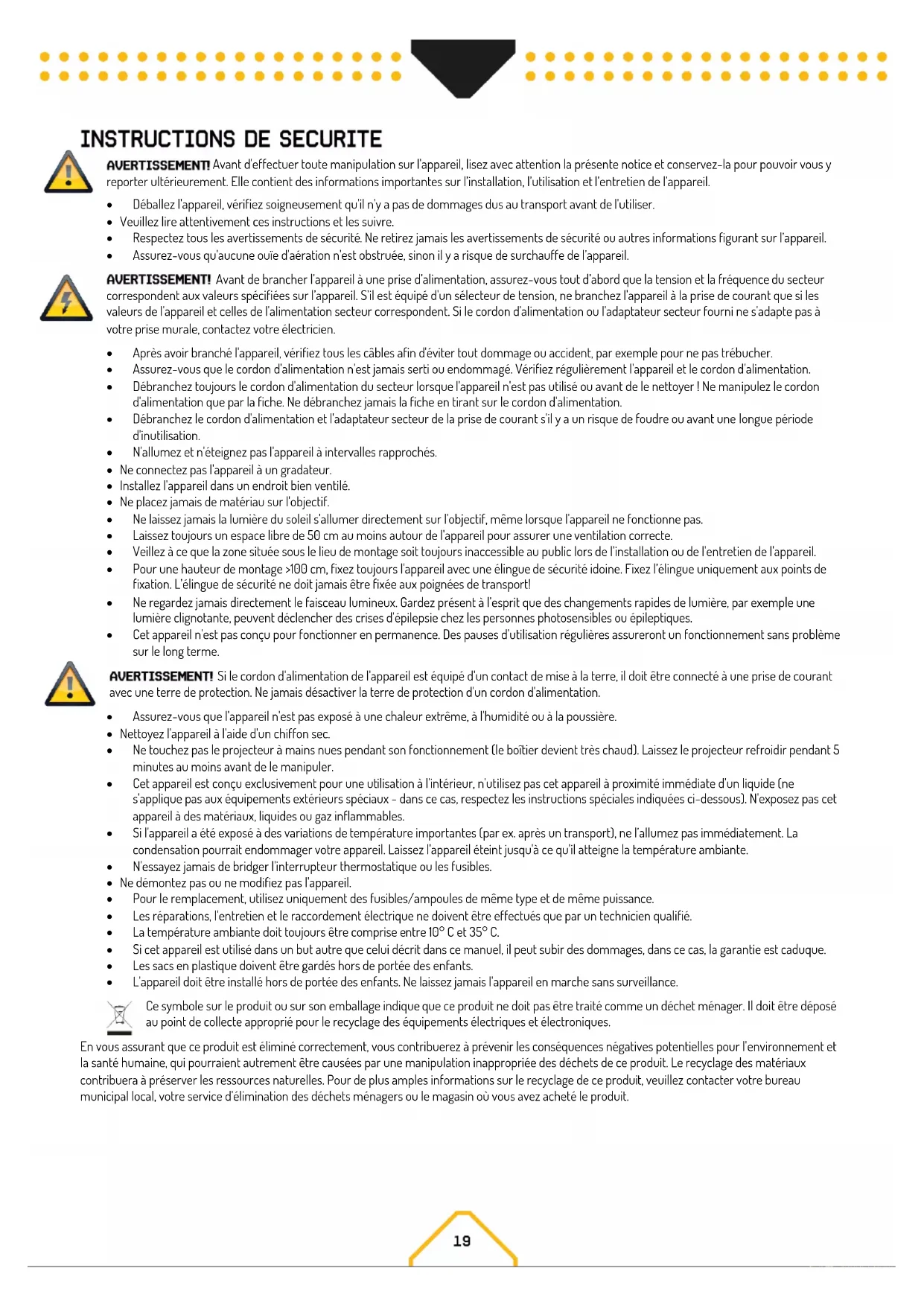 - L'appareil doit être installé hors de portée des enfants. Ne laissez jamais l'appareil en marche sans surveillance. Ce symbole sur le produit ou sur son emballage indique que ce produit ne doit pas être traité comme un déchet ménager. Il doit être déposé au point de collecte approprié pour le recyclage des équipements électriques et électroniques. En vous assurant que ce produit est éliminé correctement, vous contribuerez à prévenir les conséquences négatives potentielles pour l'environnement et la santé humaine, qui pourraient autrement être causées par une manipulation inappropriée des déchets de ce produit. Le recyclage des matériaux contribuera à préserver les ressources naturelles. Pour de plus amples informations sur le recyclage de ce produit, veuillez contacter votre bureau municipal local, votre service d'élimination des déchets ménagers ou le magasin où vous avez acheté le produit.La lumière des lasers est différente de toute autre source de lumière qui vous est familière. La lumière générée par cet appareil peut causer des dommages oculaires si l’appareil n’est pas correctement installé et utilisé. La lumière d’un laser est des milliers de fois plus concentrée que la lumière produite par toute autre source. Cette concentration de puissance peut causer de manière instantanée des blessures des yeux en brûlant la rétine. Si vous ne pouvez pas sentir la “chaleur“ d’un faisceau laser, il peut cependant causer des blessures ou aveugler le public. Même de petites qualités de lumière laser sont potentiellement dangereuses à de grandes distances. Les blessures causées par des lasers peuvent survenir plus vite qu’un simple clignement des yeux. Il est faux de croire qu'un rayon individuel venant d'une centaine de rayons laser, n’est pas dangereux pour les yeux. Il est faux de croire que regarder un faisceau mobile n'est pas dangereux. Dans les réglementations en vigueur sur la sécurité des lasers, il est interdit de diriger les lasers de classe 3B/4 dans des zones où des personnes peuvent être exposées, par exemple sur une piste de danse.