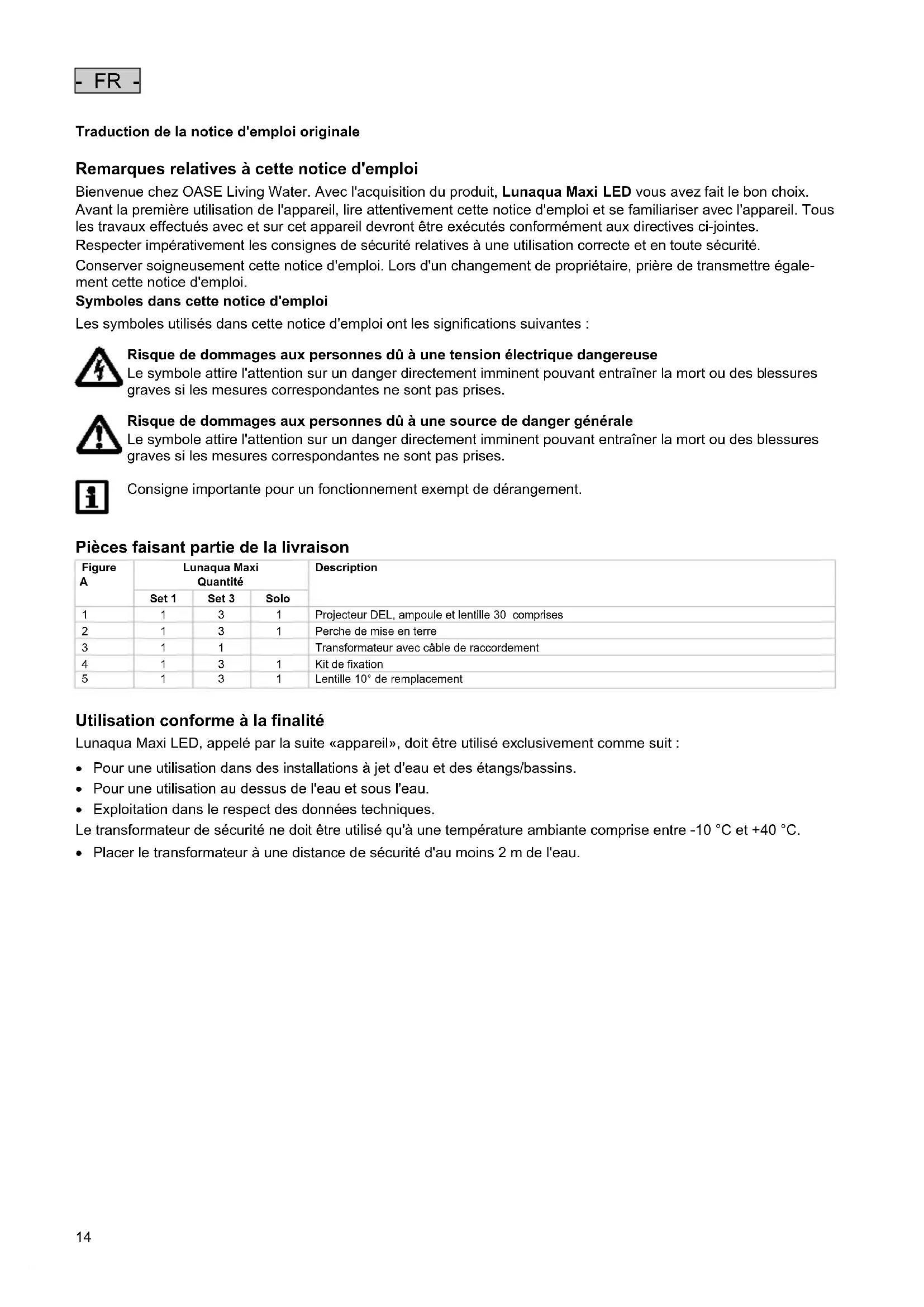 Remarques relatives à cette notice d'emploi Bienvenue chez OASE Living Water. Avec l'acquisition du produit, Lunaqua Maxi LED vous avez fait le bon choix. Avant la première utilisation de l'appareil, lire attentivement cette notice d'emploi et se familiariser avec l'appareil. Tous les travaux effectués avec et sur cet appareil devront être exécutés conformément aux directives ci-jointes. Respecter impérativement les consignes de sécurité relatives à une utilisation correcte et en toute sécurité. Conserver soigneusement cette notice d'emploi. Lors d'un changement de propriétaire, prière de transmettre égale- ment cette notice d'emploi. Symboles dans cette notice d'emploi