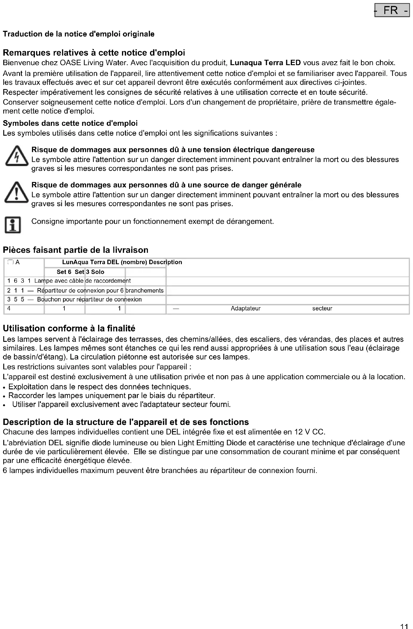 - FR - Traduction de la notice d'emploi originale Remarques relatives à cette notice d'emploi Bienvenue chez OASE Living Water. Avec l'acquisition du produit, Lunaqua Terra LED vous avez fait le bon choix. Avant la première utilisation de l'appareil, lire attentivement cette notice d'emploi et se familiariser avec l'appareil. Tous les travaux effectués avec et sur cet appareil devront être exécutés conformément aux directives ci-jointes. Respecter impérativement les consignes de sécurité relatives à une utilisation correcte et en toute sécurité. Conserver soigneusement cette notice d'emploi. Lors d'un changement de propriétaire, prière de transmettre égale- ment cette notice d'emploi. Symboles dans cette notice d'emploi Les symboles utilisés dans cette notice d'emploi ont les significations suivantes :