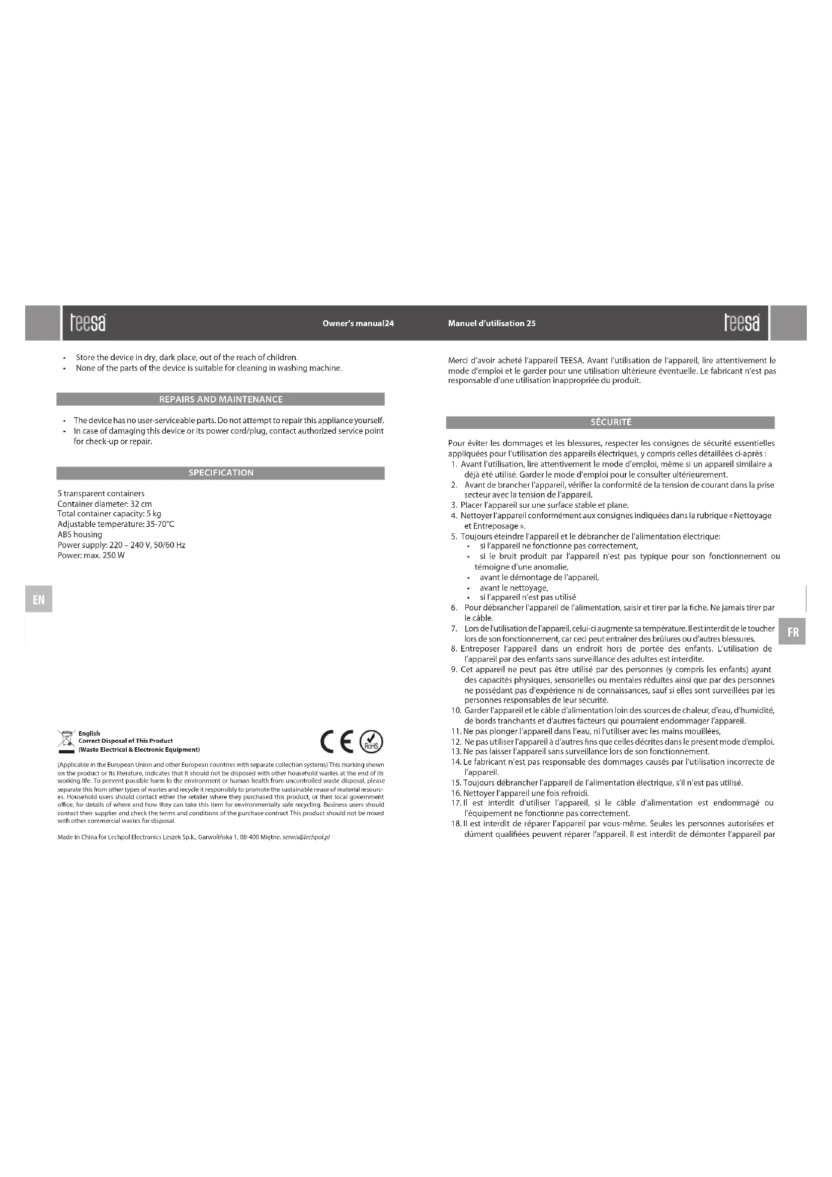 Manuel d’utilisation32 France Élimination appropriée du produit (déchets d’équipements électriques et électroniques) Les marquages apposés sur le produit ou dans les textes y correspondants indiquent que l’appareil, une fois le délai d’usage passé, doit être éliminé avec les autres déchets ménagers. Pour éviter les eets néfastes sur l’environnement et la santé humaine, suite à une élimination de déchets non contrôlée, veuillez séparer le produit des autres déchets et recycler de manière responsable, pour promouvoir la réutilisation des matériaux comme une pratique durable. Pour de plus amples informations concernant le lieu et le recyclage en toute sécurité du produit, les utilisateurs dans les ménages doivent contacter le distributeur chez qui ils ont acheté le produit ou une autorité locale compétente dans le domaine. Les utilisateurs dans les entreprises doivent contacter leur fournisseur et vérier les conditions du contrat d’achat. Ne pas éliminer le produit avec d’autres déchets commerciaux. Fabriqué en RPC pour Lechpol Electronics Leszek Sp.k., ul. Garwolińska 1, 08-400 Miętne. serwis@lechpol.pl SPÉCIFICATIONS 5 plateaux transparents Diamètre du plateau : 32 cm Capacité totale : 5 kg Réglage de la température : 35-70°C Boîtier en plastique ABS Alimentation : 220 – 240 V, 50/60 Hz Puissance : max. 250 W Σας ευχαριστούμε για την αγορά της συσκευής TEESA. Διαβάστε προσεκτικά αυτές τις οδηγίες χρήσης πριν τη χρήση και φυλάξτε το για μελλοντική χρήση. Ο διανομέας δεν αναλαμβάνει καμία ευθύνη για ζημιές που προκλήθηκαν από ακατάλληλο χειρισμό και χρήση του προϊόντος. ΟΔΗΓΙΕΣ ΑΣΦΑΛΕΙΑΣ Για να μειώσετε τους τραυματισμούς ή τις ζημιές, ακολουθήστε τις βασικές προφυλάξεις ασφαλείας που εφαρμόζονται κατά τη χρήση οποιασδήποτε ηλεκτρικής συσκευής, συμπεριλαμβανομένων των