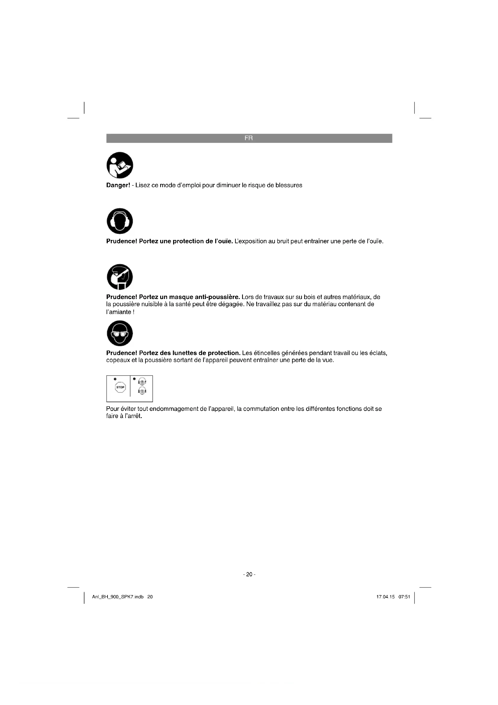 Danger! - Lisez ce mode d’emploi pour diminuer le risque de blessures Prudence! Portez une protection de l’ouïe. L’exposition au bruit peut entraîner une perte de l’ouïe. Prudence! Portez des lunettes de protection. Les étincelles générées pendant travail ou les éclats, copeaux et la poussière sortant de l’appareil peuvent entraîner une perte de la vue. Prudence! Portez un masque anti-poussière. Lors de travaux sur su bois et autres matériaux, de la poussière nuisible à la santé peut être dégagée. Ne travaillez pas sur du matériau contenant de l’amiante ! Pour éviter tout endommagement de l’appareil, la commutation entre les diff érentes fonctions doit se faire à l’arrêt. Anl_BH_900_SPK7.indb 20Anl_BH_900_SPK7.indb 20 17.04.15 07:5117.04.15 07:51FR