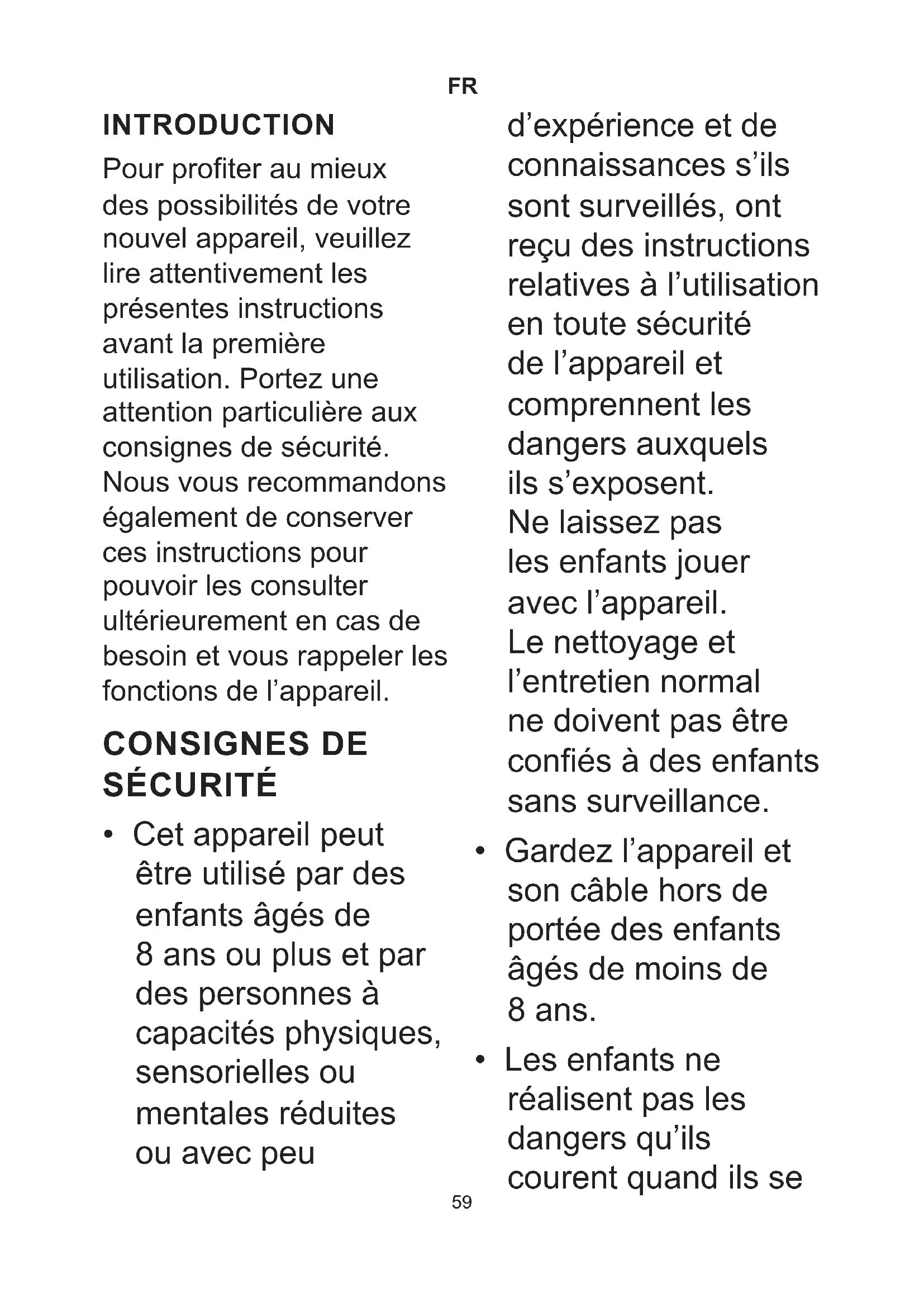 - Cet appareil peut être utilisé par des enfants âgés de 8 ans ou plus et par des personnes à capacités physiques, sensorielles ou mentales réduites ou avec peu d’expérience et de connaissances s’ils sont surveillés, ont reçu des instructions relatives à l’utilisation en toute sécurité de l’appareil et comprennent les dangers auxquels ils s’exposent. Ne laissez pas les enfants jouer avec l’appareil. Le nettoyage et l’entretien normal ne doivent pas être conés à des enfants sans surveillance.