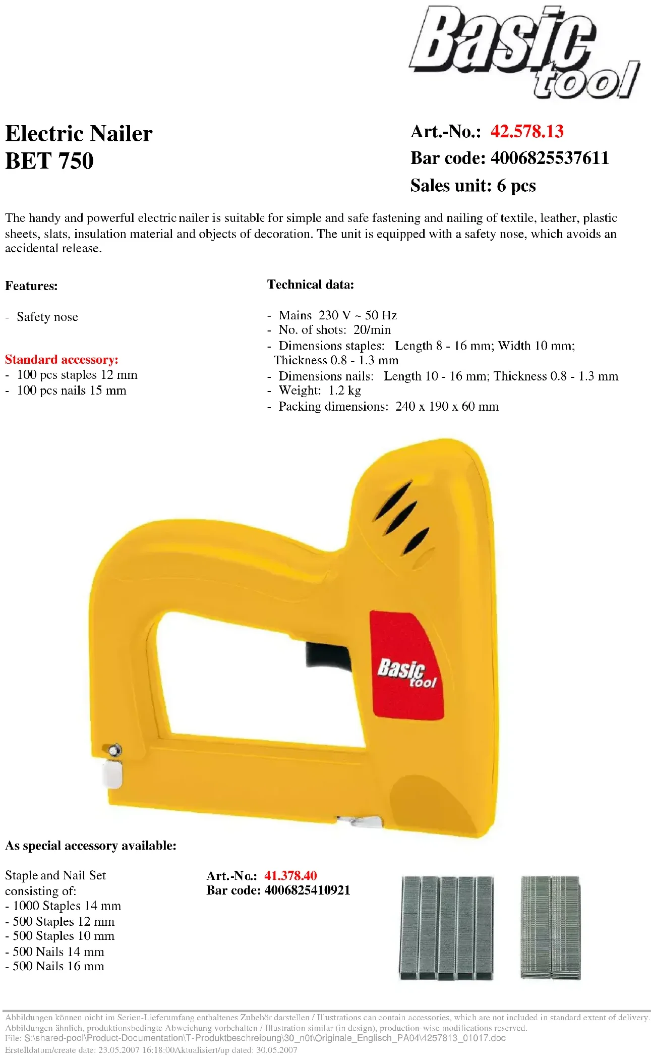 Téléchargez la notice de votre Agrafeuse au format PDF gratuitement ! Retrouvez votre notice BET 750 - Basic tool et reprennez votre appareil électronique en main. Sur cette page sont publiés tous les documents nécessaires à l'utilisation de votre appareil BET 750 de la marque Basic tool.