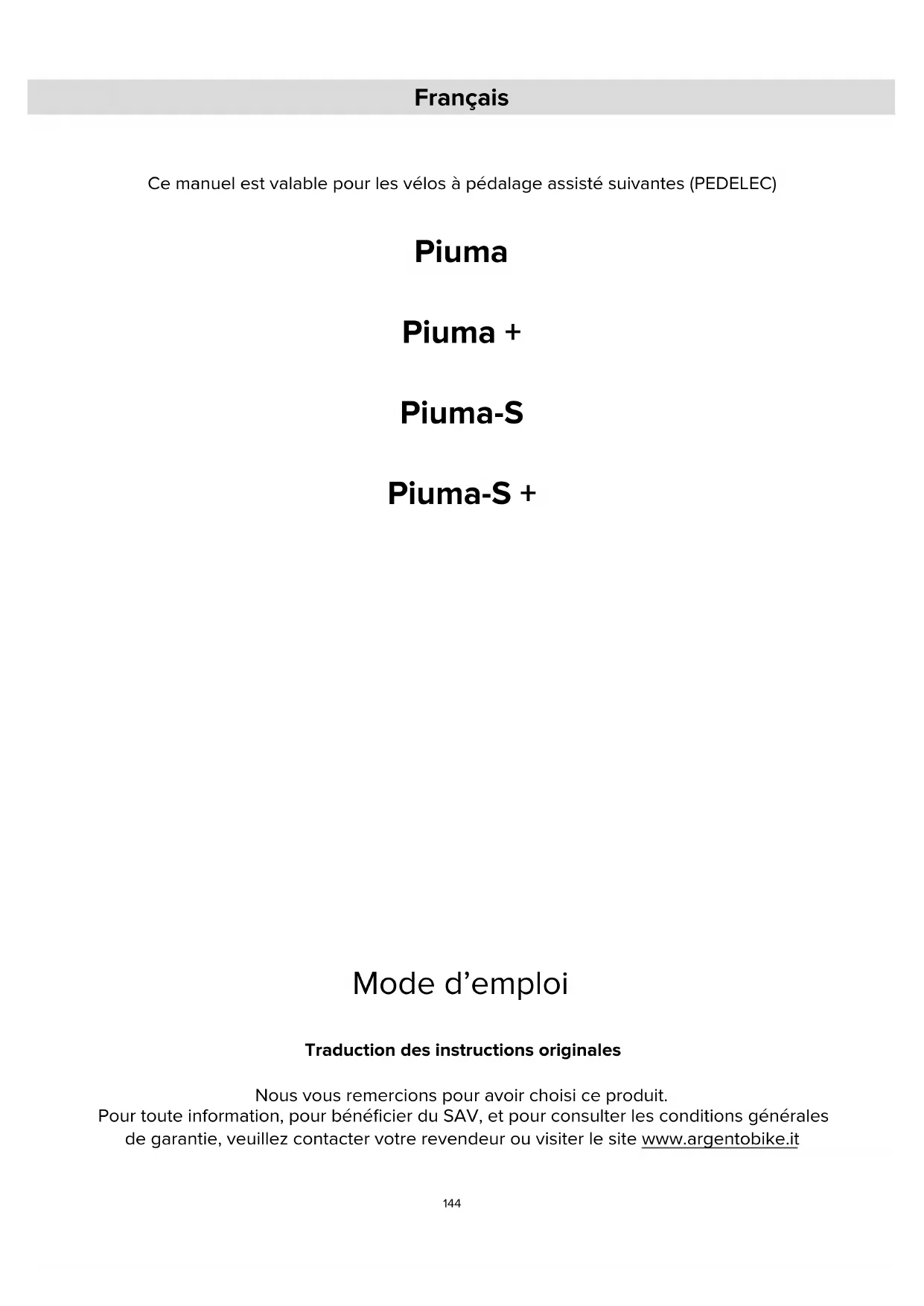 ATTENTION Traitement des batteries usagées (applicable dans tous les pays de l'Union européenne et dans d'autres systèmes européens équipés de systèmes de tri sélectif). Ce symbole sur le produit ou sur l'emballage indique que la batterie ne doit pas être considérée comme un déchet ménager normal. Sur certains types de batteries, ce symbole peut être utilisé en combinaison avec un symbole chimique. Les symboles chimiques du mercure (Hg) ou du plomb (Pb) sont ajoutés si la batterie contient plus de 0,0005% de mercure ou de 0,004% de plomb. En vous assurant que les batteries sont éliminées correctement, vous contribuerez à éviter les conséquences négatives potentielles pour l'environnement et la santé qui pourraient autrement être causées par leur mise au rebut inappropriée. Le recyclage des matériaux permet de conserver les ressources naturelles. Dans le cas de produits qui, pour des raisons de sécurité, de performance ou de protection des données, nécessitent une connexion fixe à une pile/batterie interne, celle-ci ne doit être remplacée que par du personnel de maintenance qualifié. Livrez le produit en fin de vie à des points de collecte adaptés à l'élimination des équipements électriques et électroniques: cela garantit que la batterie à l'intérieur est également traitée correctement. Pour plus d'informations sur la mise au rebut de la pile-batterie usée ou du produit, vous pouvez contacter le service local pour l’élimination des déchets ou le point de vente où vous l'avez acheté. Dans tous les cas, il faut eectuer l’élimination conformément à la normative en vigueur dans le pays d’achat.192 Benutzerhandbuch Übersetzung der Originalanweisungen Vielen Dank, dass Sie sich für dieses Produkt entschieden haben. Für Informationen, technische Unterstützung, Kundendienst und die allgemeinen Garantiebedingungen wenden Sie sich an Ihren Händler oder besuchen Sie die Website www.argentobike.it Deutsch Dieses Handbuch gilt für die folgenden Pedelecs (EPAC) Piuma Piuma + Piuma-S Piuma-S +193