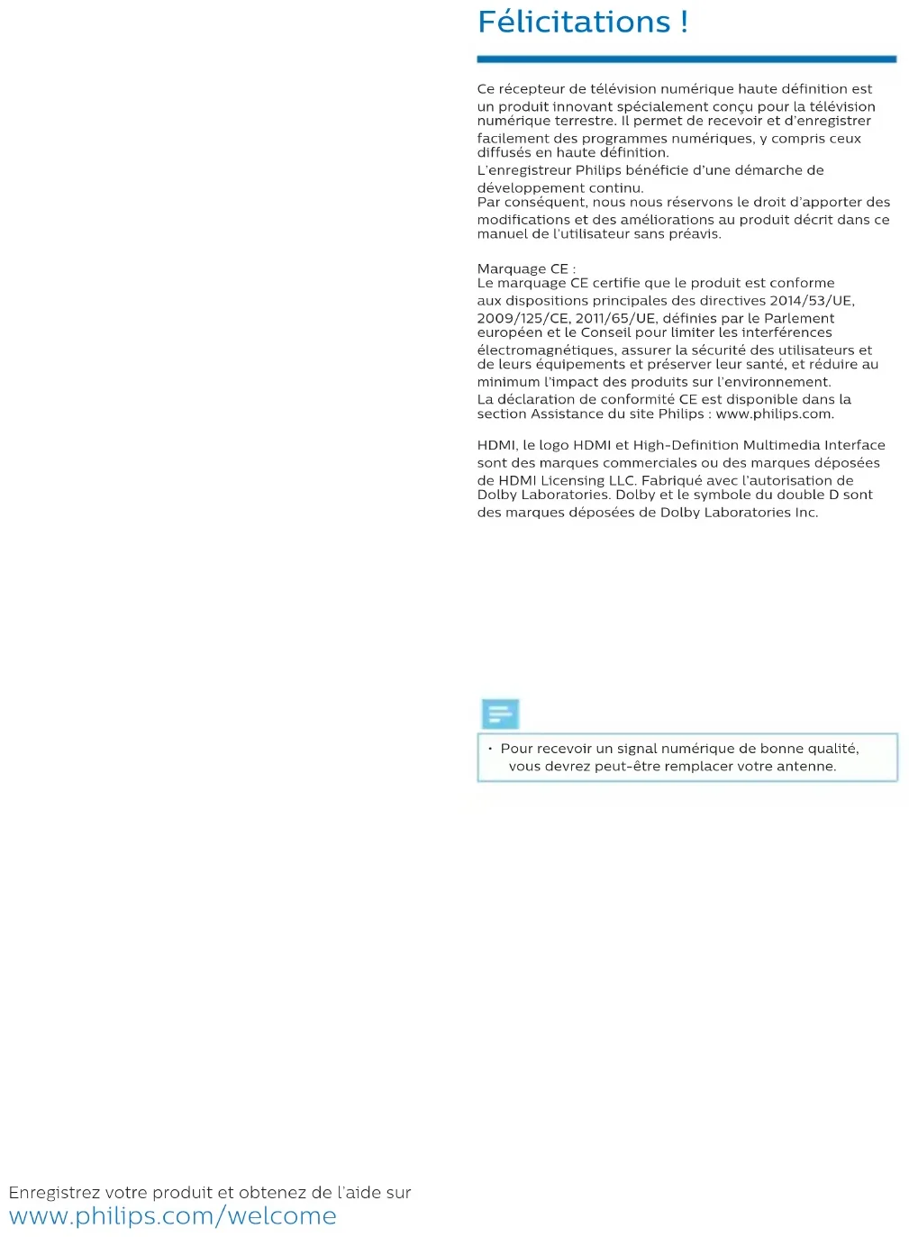 Digital receiver Terrestrial DTR3600 Manuel de l’utilisateur2 Félicitations ! Ce récepteur de télévision numérique haute définition est un produit innovant spécialement conçu pour la télévision numérique terrestre. Il permet de recevoir et d’enregistrer facilement des programmes numériques, y compris ceux diffusés en haute définition. L’enregistreur Philips bénéficie d’une démarche de développement continu. Par conséquent, nous nous réservons le droit d’apporter des modifications et des améliorations au produit décrit dans ce manuel de l’utilisateur sans préavis. Marquage CE : Le marquage CE certifie que le produit est conforme aux dispositions principales des directives 2014/53/UE, 2009/125/CE, 2011/65/UE, définies par le Parlement européen et le Conseil pour limiter les interférences électromagnétiques, assurer la sécurité des utilisateurs et de leurs équipements et préserver leur santé, et réduire au minimum l’impact des produits sur l’environnement. La déclaration de conformité CE est disponible dans la section Assistance du site Philips : www.philips.com. HDMI, le logo HDMI et High-Definition Multimedia Interface sont des marques commerciales ou des marques déposées de HDMI Licensing LLC. Fabriqué avec l’autorisation de Dolby Laboratories. Dolby et le symbole du double D sont des marques déposées de Dolby Laboratories Inc.