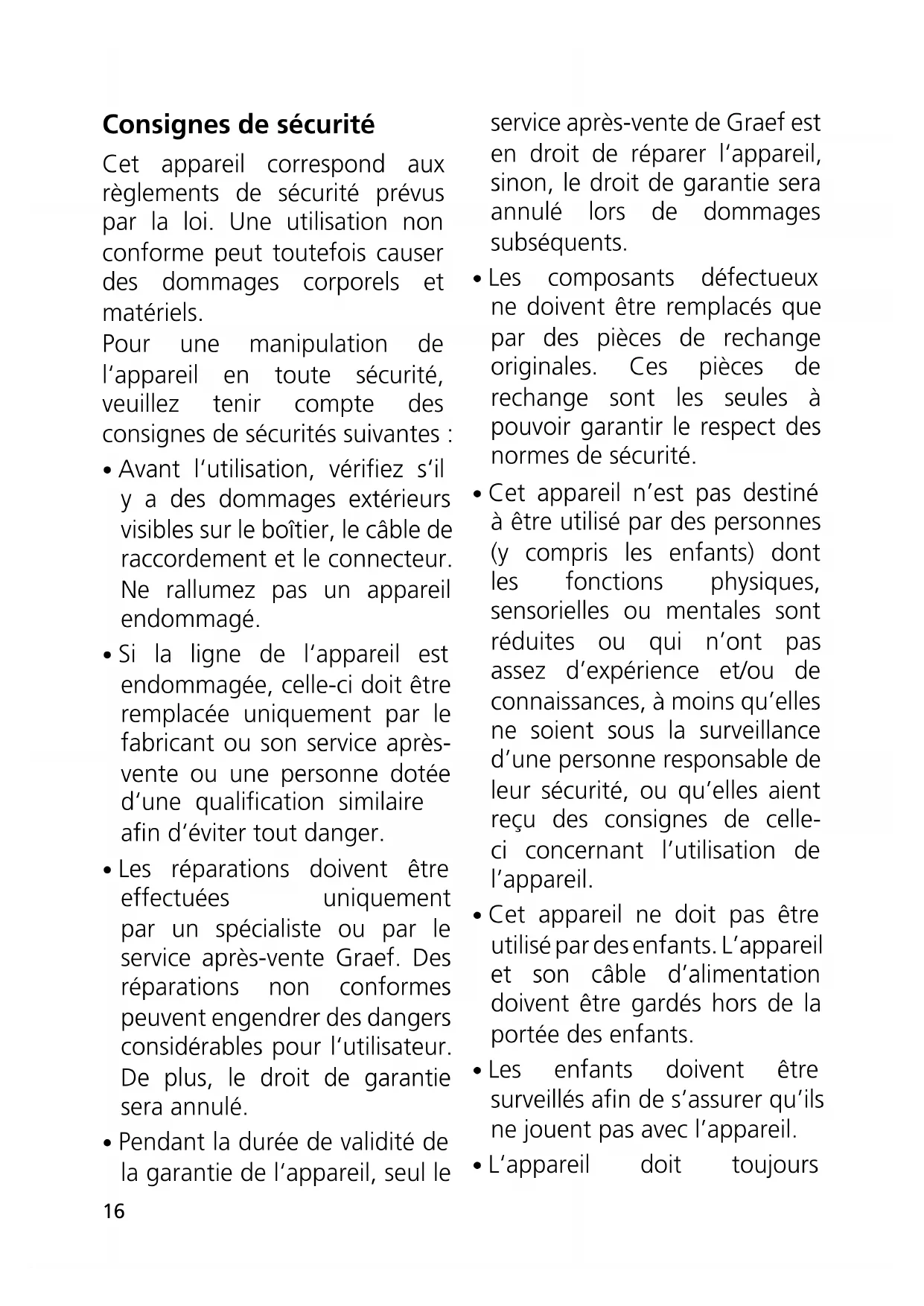 - Pendant la durée de validité de la garantie de l‘appareil, seul le service après-vente de Graef est en droit de réparer l‘appareil, sinon, le droit de garantie sera annulé lors de dommages subséquents.